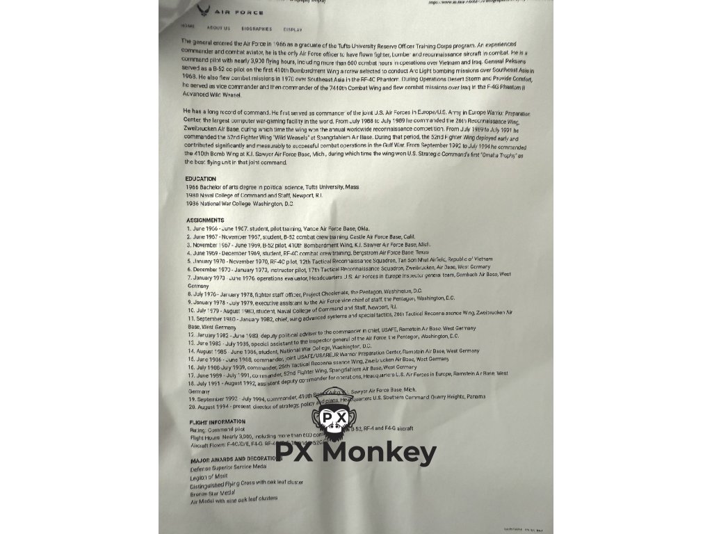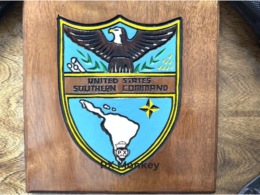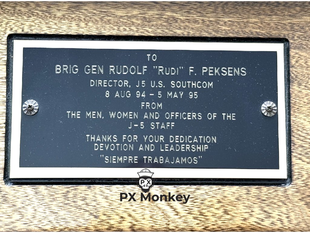 Pamětní plaketa Ret. Gen. Rudolf "Rudy" F. Pekens U.S. Southern Command Leadership Plaque. Plaketa má rozměr 76 x 55cm.