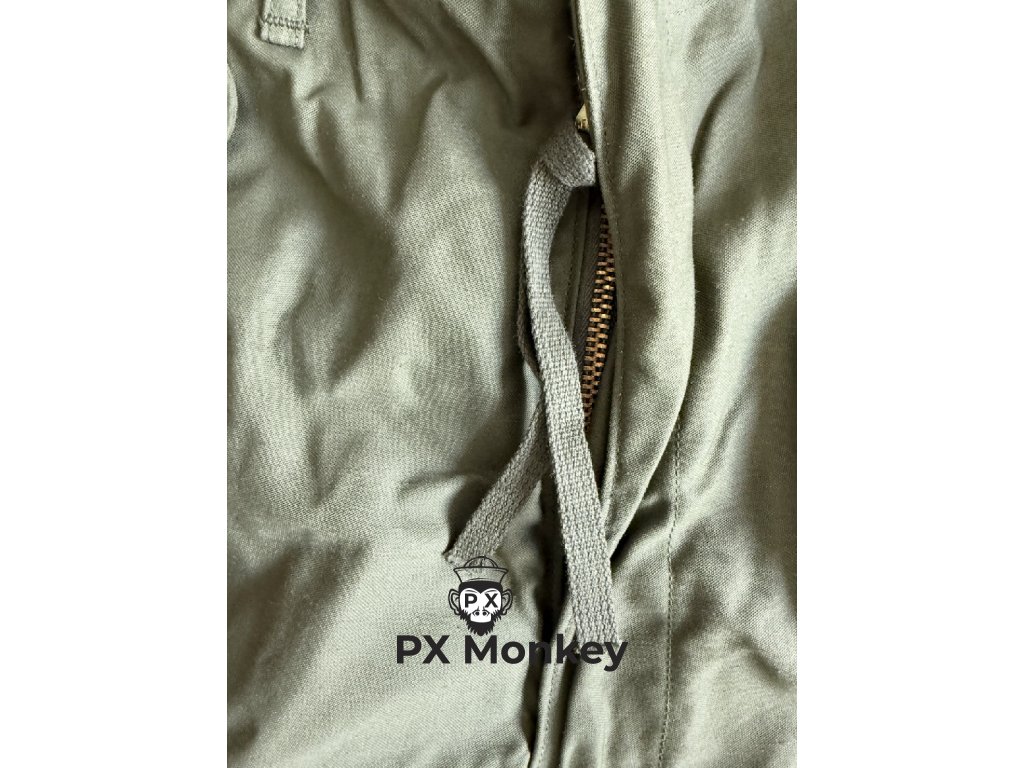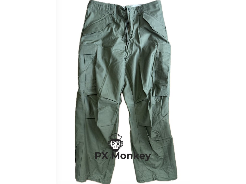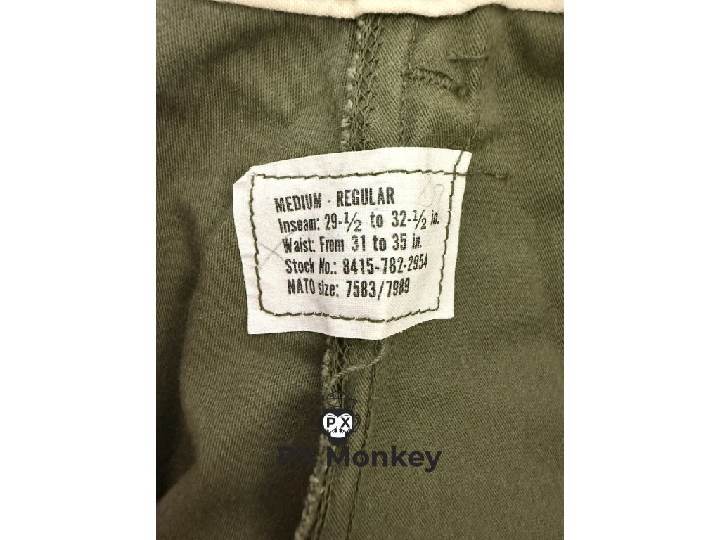 Tento exemplář ve velikosti MEDIUM - REGULAR je ideální pro běžnou postavu a je mezi sběrateli velmi vyhledávaný. Kalhoty jsou ušity z legendární tkaniny NYCO Sateen (50 % bavlna, 50 % nylon), která je známá svou extrémní odolností a ochranou proti větru. Disponují masivním mosazným zipem s textilním táhlem a všemi dobovými detaily včetně knoflíků pro zimní vložku.