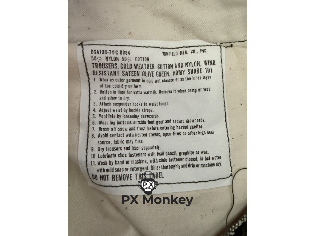 Nabízíme ikonický kus vojenské historie v nejpopulárnější velikosti. Originální kalhoty Trousers, Cold Weather, M-65 z kontraktu roku 1974. Vyrobeny v USA firmou Winfield Mfg. Co., Inc..