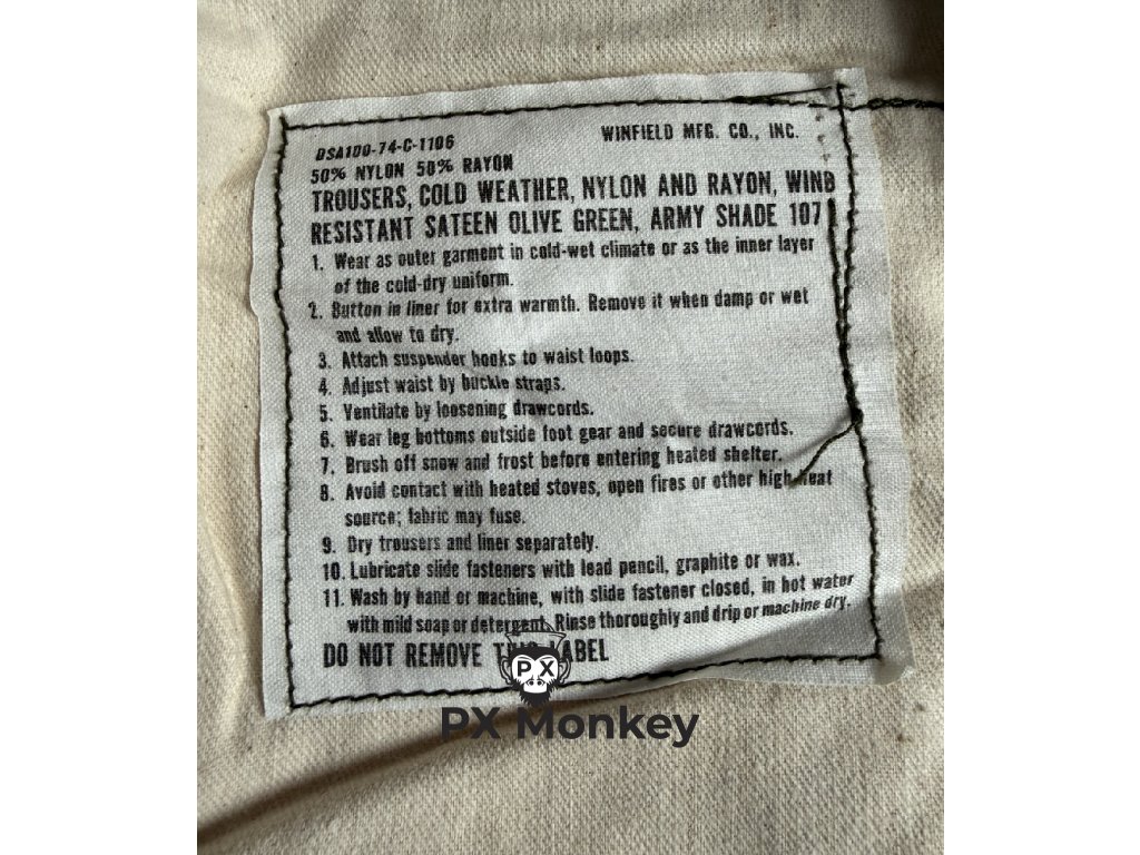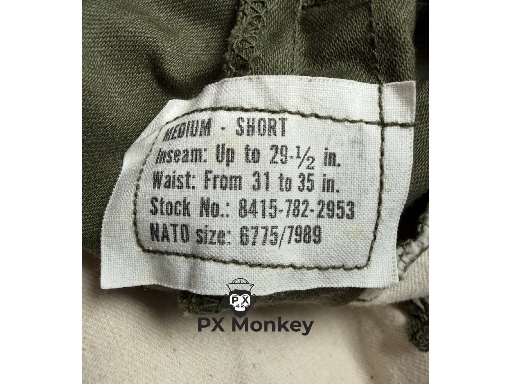Nabízíme skutečnou lahůdku pro sběratele uniforem z období Války ve Vietnamu a studené války. Tyto originální kalhoty M-65 z roku 1974 nejsou vyrobeny z běžné bavlny, ale z méně obvyklé směsi 50 % Nylon a 50 % Rayon(viskóza/umělé hedvábí). Tato látka má specifické vlastnosti, je splývavější a na dotek jemnější než klasický "NYCO", přičemž si zachovává odolnost.