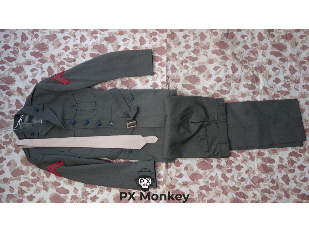 Pěkné USMC Green Uniform sako 39XL, kalhoty 33L s kravatou. Na saku je i pásek, který často chybí.