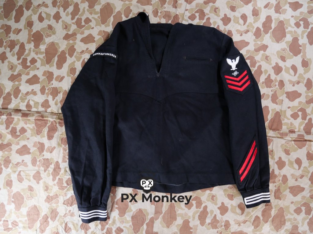 Komplet US. Navy (Blue Dress). Jumper vel. 48R na rukávu je oblouček COMNAVFOR KOREA (Commander, US Naval Forces, Korea). Kalhoty vel. 40L. Jumper i kalhoty jsou podepsány J. D. Ford.