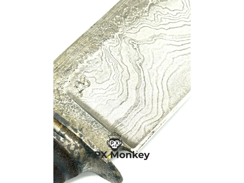 Ein absolut außergewöhnliches Stück für Liebhaber höchster Messerschmiedekunst und historischer Materialien. Dieses massive, handgeschmiedete Messer im Bowie-Stil stammt aus der Werkstatt eines renommierten, anonymen Meisterschmieds. Die beeindruckende Klinge mit einer Länge von 210 mm und einer Stärke von 5,5 mm am Klingenrücken ist aus wunderschönem Schweißdamast geschmiedet, der den Kohlenstoff-Werkzeugstahl ČSN 19418 und den schwedischen Premiumstahl Uddeholm 75ni8 kombiniert. Das Messer ist auf kompromisslose 61-62 HRCgehärtet, mit einem Flachschliff versehen und auf 23 Grad rasiermesserscharf abgezogen. Das absolute Highlight ist der Griff, der aus geschichtetem Leder eines alten, historischen Treibriemens gefertigt ist. Dieses mit Leinöl behandelte Material verleiht dem Messer eine unglaubliche Patina, Geschichte und einen perfekten, rutschfesten Griff. Parierelement und Knauf bestehen aus gehämmertem und feuerpatiniertem Stahl. Das Messer verfügt über eine extrem robuste Konstruktion: Der Erl geht durch den gesamten Griff, ist mit einem Stift gesichert, am Ende über dem Knauf vernietet und zusätzlich mit Epoxidharz verklebt. Zum Messer gehört eine massive, handgenähte Scheide aus hochwertigem, durchgefärbtem Rindsleder. Hinweis für Kenner: Es handelt sich um hochkohlenstoffhaltigen, sogenannten "lebendigen Stahl" (nicht rostfrei). Die Klinge entwickelt mit der Zeit eine authentische Patina und benötigt gelegentliche Pflege.