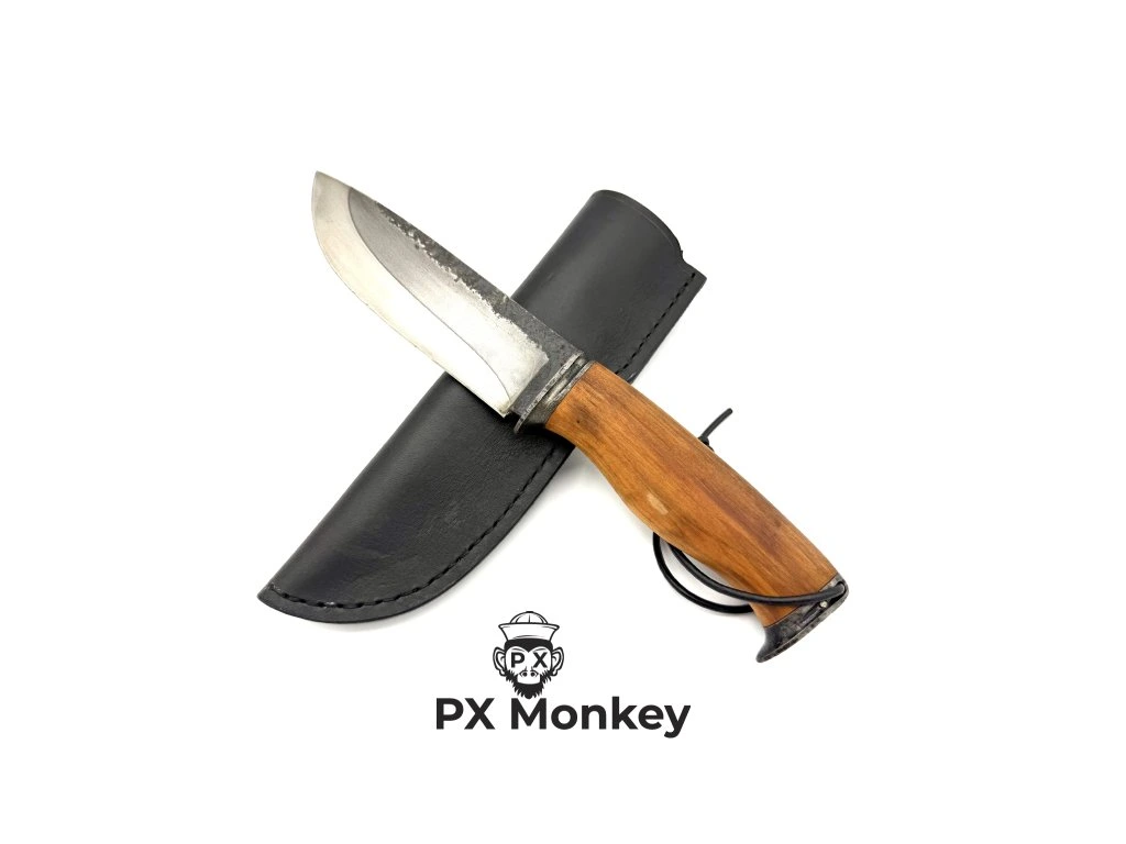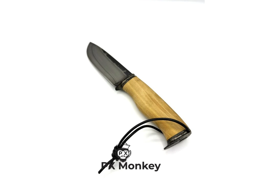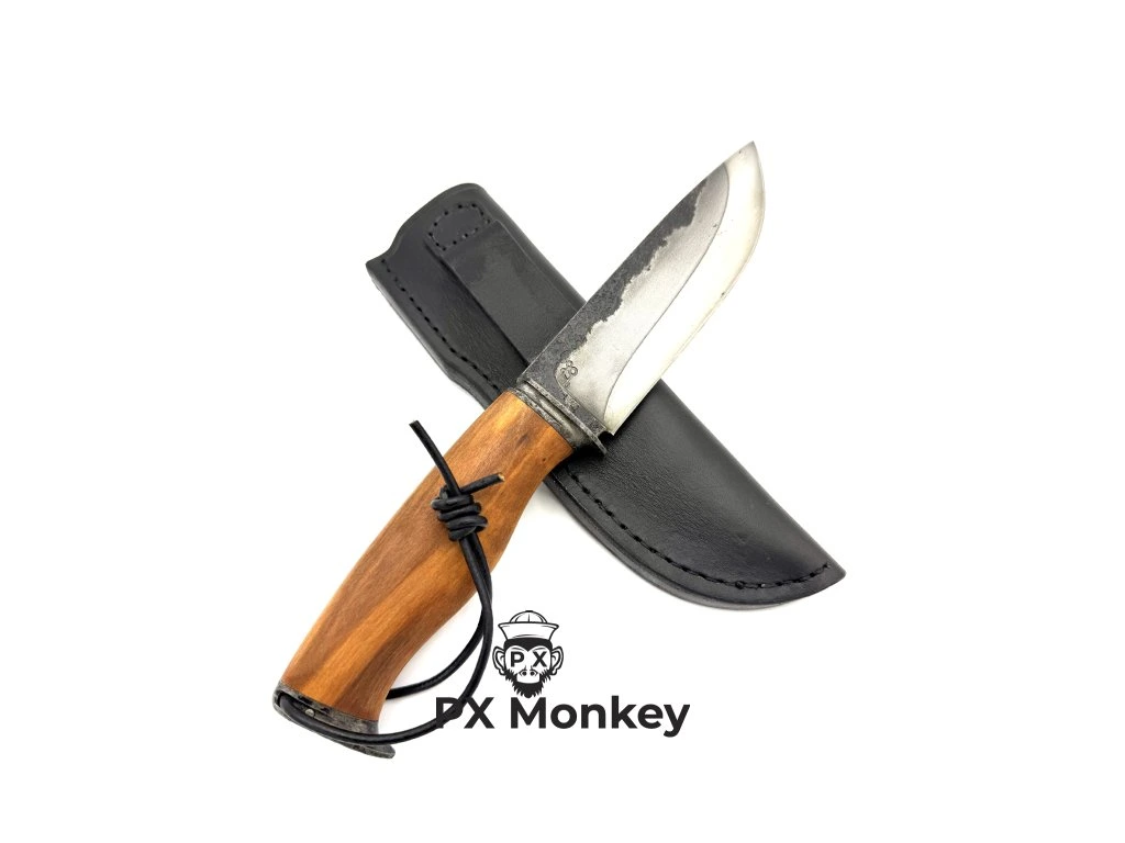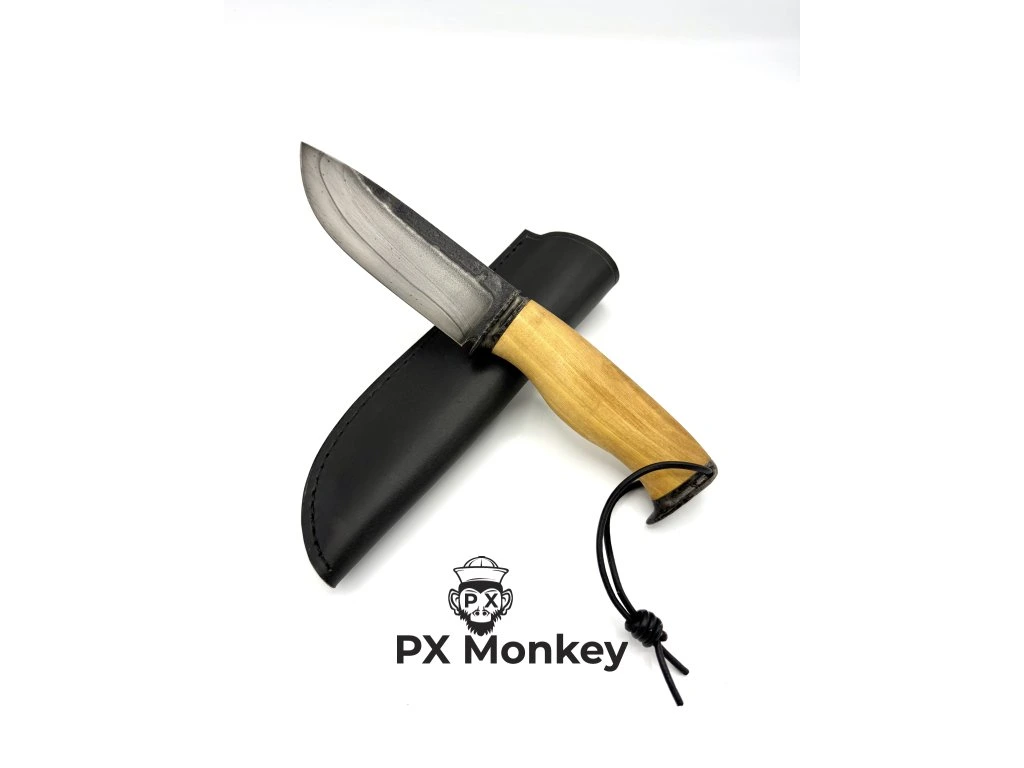Wir präsentieren Ihnen ein absolutes Juwel der Messerschmiedekunst – ein Set aus zwei gepaarten Messern, die als spiegelbildliches Duo entworfen wurden. Beide Messer teilen identische, massive Proportionen (Gesamtlänge 260 mm, Klinge 137 mm, Klingenrücken 5 mm) und eine kompromisslose, fast unzerstörbare Konstruktion mit vernietetem Durchsteckerl. Dennoch hat jedes Messer seinen eigenen, einzigartigen Charakter. Das erste Messer ist aus Kohlenstoff-Werkzeugstahl 19191 geschmiedet, mit einer meisterhaften partiellen Härtung, die einen seltenen Hamon Utsuri erzeugt. Dies verleiht der Schneide eine extreme Härte von 61-62 HRC, während der Rücken zäh bleibt. Der Griff besteht aus edlem Walnussholz und ruht in einer massiven Scheide für Rechtshänder. Das zweite Messer ist lebendige Geschichte. Seine Klinge wurde aus der Blattfeder (Stahl 14260) des legendären tschechoslowakischen Lastwagens Praga V3Sgeschmiedet. Der Stahl, der unter härtesten Bedingungen gedient hat, bekommt nun ein neues Leben. Die Klinge hat einen klassischen Hamon und eine Härte von 57-58 HRC. Der Griff besteht aus robustem Apfelbaumholz und das Messer wird mit einer Spiegelscheide für Linkshänder geliefert. Die Schneiden beider Messer sind präzise auf 24 Grad geschliffen. Parierelemente und Knäufe sind aus gehämmertem und feuerpatiniertem Stahl. Hinweis: Es handelt sich um hochkohlenstoffhaltigen, "lebendigen Stahl". Die Klingen entwickeln mit der Zeit eine Patina und benötigen gelegentliche Pflege mit Öl oder Fett.