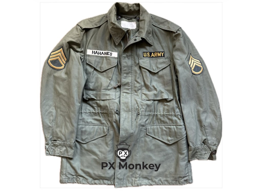 Hier bieten wir ein außergewöhnliches Stück Militärgeschichte an: eine originale US Army M-1951 Feldjacke aus den späten 1950er Jahren. Diese Jacke befindet sich in einem fast neuwertigen Zustand mit nur leichter Lagerpatina. Die Jacke ist komplett mit zeitgenössischen Original-Abzeichen (Namensschild MAHANES, U.S. ARMY, Sergeant First Class) versehen. Hauptmerkmale: