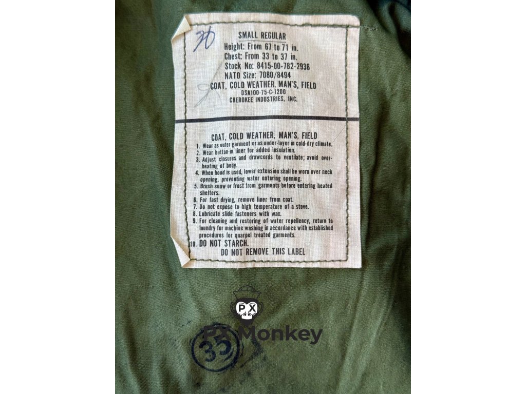 Hier bieten wir den ultimativen Klassiker an: Eine originale US Army M65 Feldjacke. Keine Reproduktion, sondern ein echtes Stück Geschichte aus dem Jahr 1975 (Vertrag DSA100-75-C-1200), hergestellt von Cherokee Industries. Der Zustand ist atemberaubend: Die Jacke ist absolut ungetragen und ungewaschen (Deadstock / NOS). Der Stoff ist noch griffig und fest. Besonders wertvoll für Sammler sind die schweren Messing-Reißverschlüsse der Marke SERVAL(Haupt- und Kragenreißverschluss). Die Jacke verfügt über 4 Fronttaschen, einen Kordelzug an Taille und Saum sowie eine versteckte Kapuze im Kragen. (Hinweis: Leichte handschriftliche Inventar-Markierungen auf dem Etikett belegen die authentische militärische Herkunft). Zustand: Fabrikneu aus altem Lagerbestand (Deadstock).