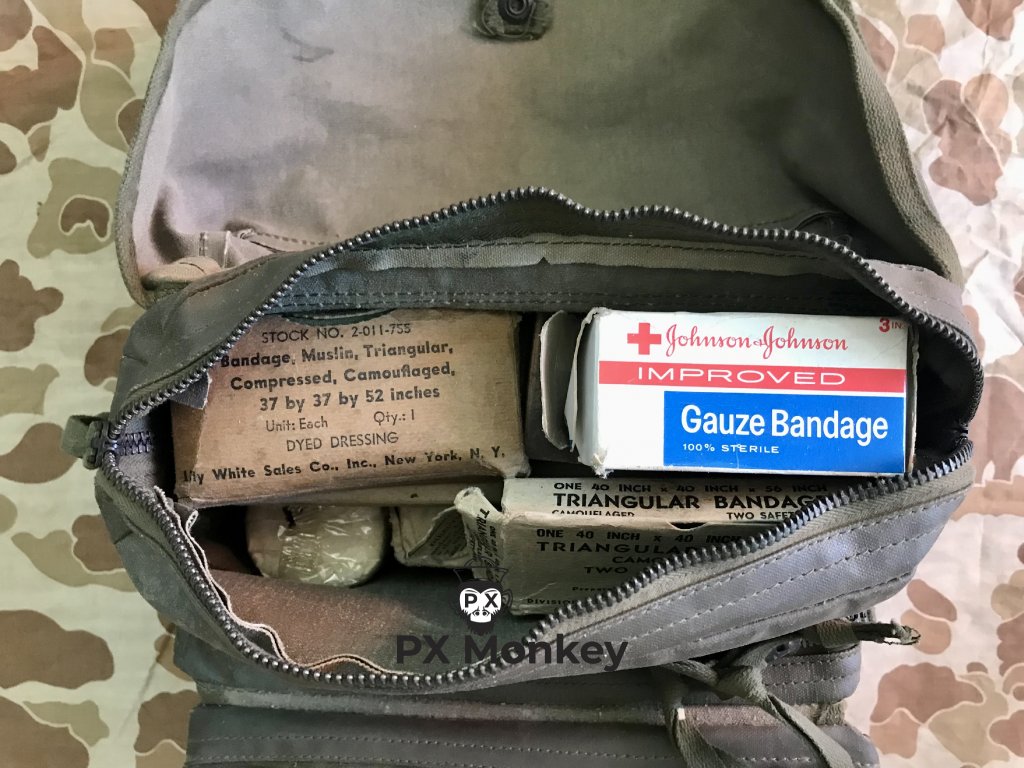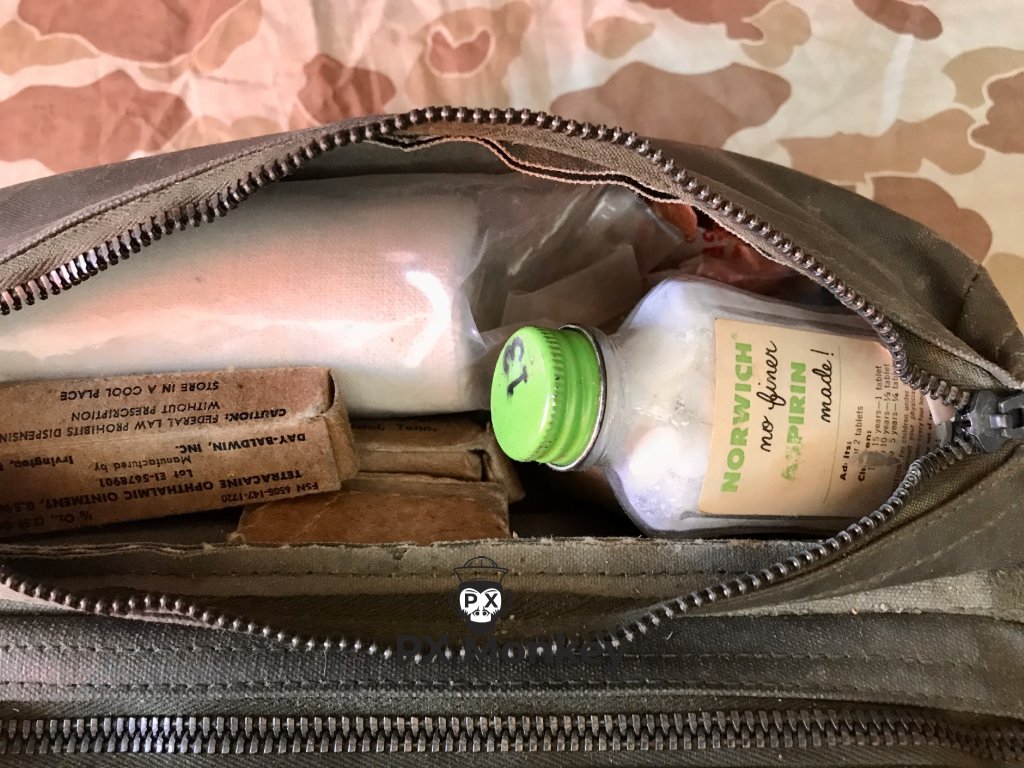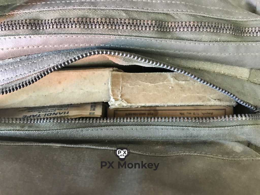 Gummierte Verbandskasten M3 gummiert mit Inhalt. Verbandskasten ist in sehr gutem Zustand. Alle Reißverschlüsse sind funktionsfähig. Der Inhalt ist nur für Sammlerzwecke gedacht - medizinisches Zubehör und Medikamente haben ihr Verfallsdatum längst überschritten.