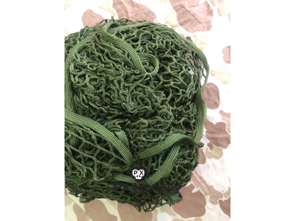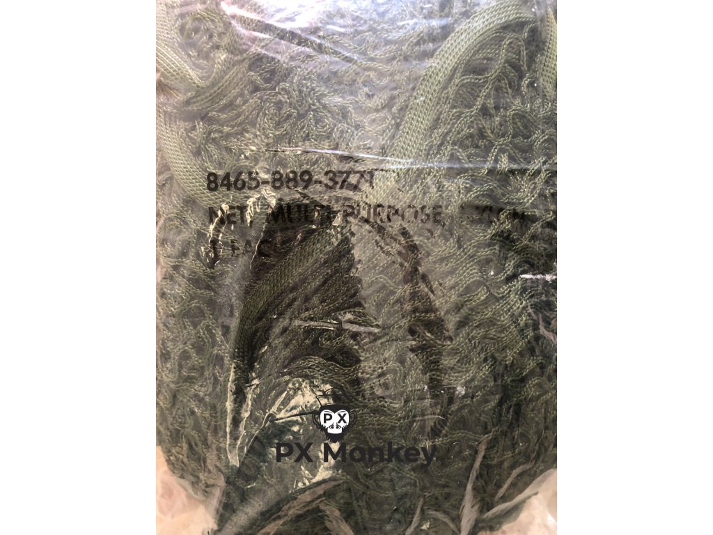 Das Original-Mehrzwecknetz. Das Mehrzwecknetz besteht aus olivgrünem Nylon, wiegt 1 Pfund und misst ungefähr 5 Fuß mal 9 Fuß (60 mal 108 Zoll). An jedem Netz sind zwei 14-Fuß-Schnüre befestigt, die als Aufhängeseile dienen, wenn das Netz als Hängematte verwendet wird.