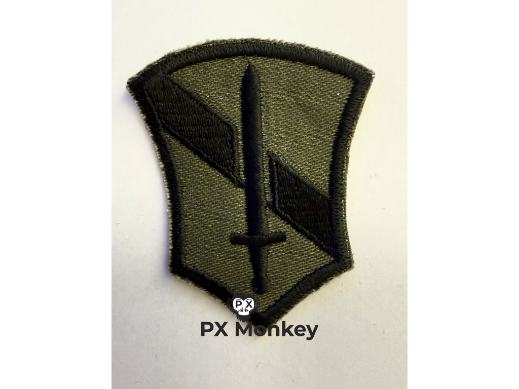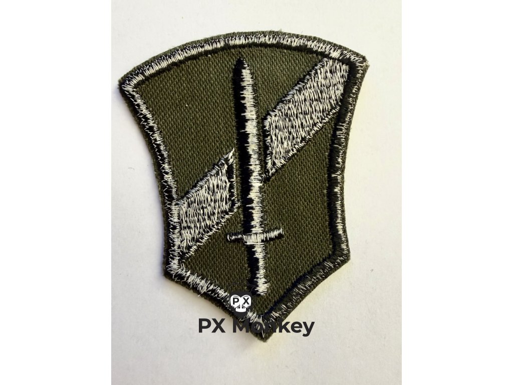 Design: Das schildförmige Abzeichen zeigt ein vertikales Schwert, das ein diagonales Band kreuzt. Das Schwert steht für Kampfkraft, das Band ist eine Hommage an alte Kavallerie-Traditionen.