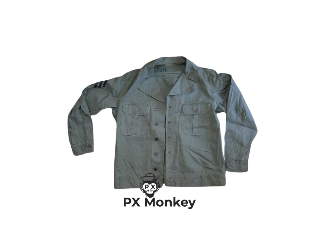 Sehr schöne Bluse "The First Pattern" HBT. 1941 eingeführte Bluse aus Fischgrätenköper-Material. Größe 42R. Die Ärmel sind mit Rangabzeichen gespritzt.