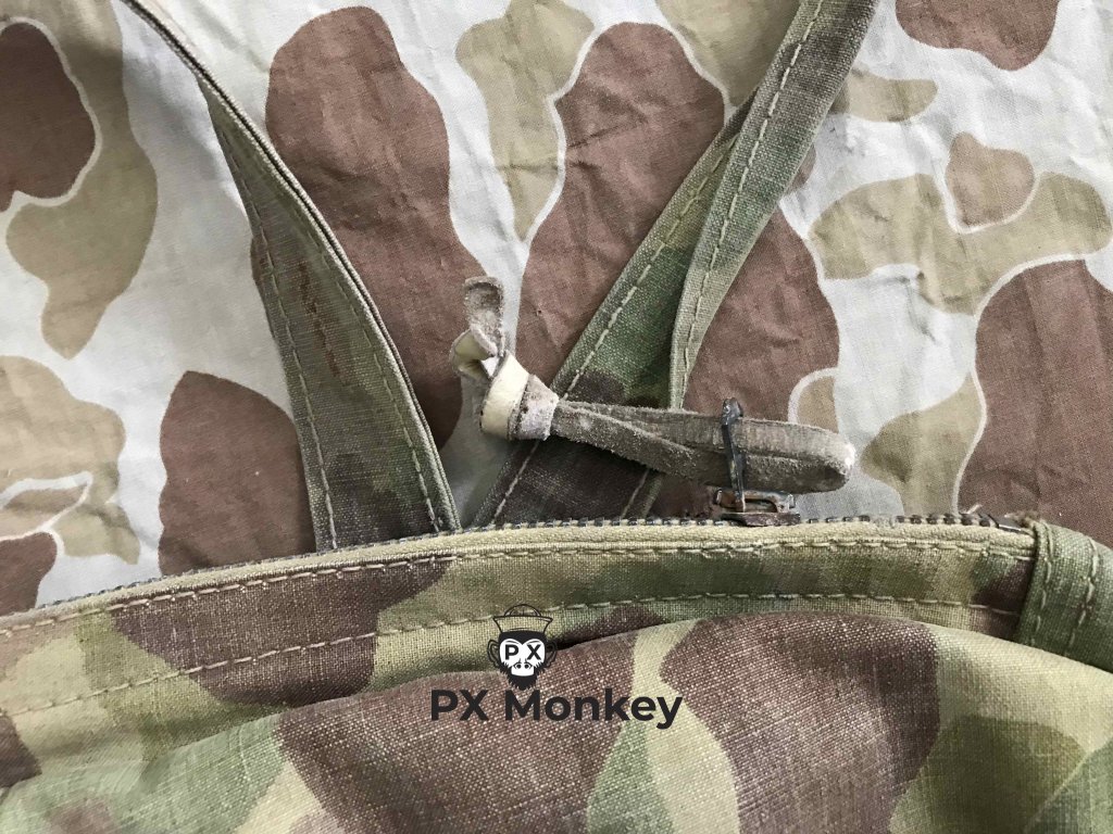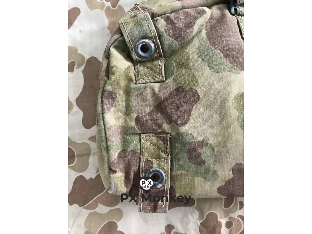 Original M 55 Reising-Maschinenpistolentasche in Froschhauttarnung, die von den Paramarines verwendet wurde. Die Tasche wurde beim Absprung unter dem Reservefallschirm getragen, am Gürtel oder konnte am Bein befestigt werden. Die Tasche ist in sehr gutem Zustand. Der Reißverschluss ist unbeschädigt.