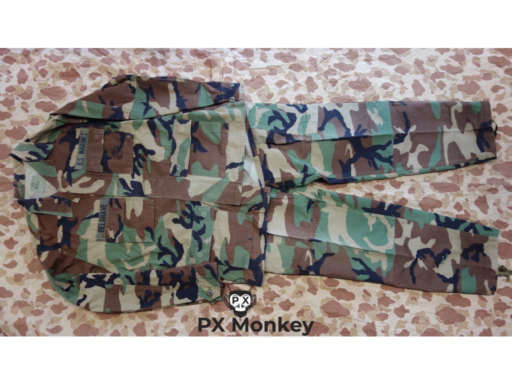 Pěkný USMC komplet v maskování Woodland z materiálu ripstop. Blůza je ve velikosti M-L a kalhoty M-R.