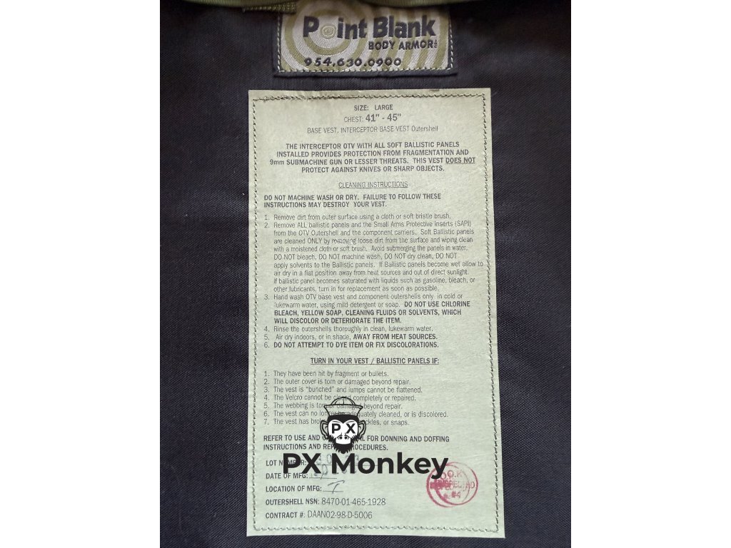 Up for sale is a true holy grail of modern military collecting: a genuine IBA (Interceptor Body Armor) system, specifically the OTV (Outer Tactical Vest) carrier with full accessories. This vest is in classic M81 Woodland camouflage with the early-era black interior. This specific set is unparalleled due to its pristine, unissued condition (New Old Stock / Deadstock). Manufactured by the premier contractor, Point Blank Body Armor, under the 1998 contract (DAAN02-98-D-5006). The Main Collector Feature: The entire set features Matched Serial Numbers. The OTV carrier label, the rear ballistic insert, the collar, and neck protectors all bear the identical serial number. This proves that this set is exactly as it left the factory over 20 years ago. This is an Ultimate Set, Including: