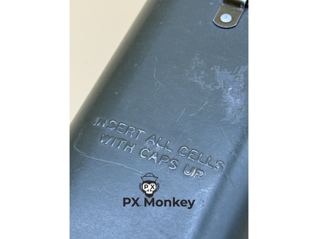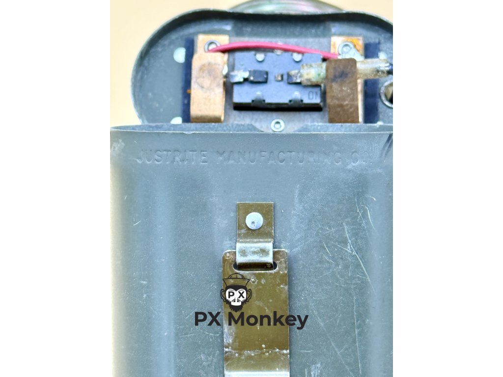 Markings: Prominently stamped "JUSTRITE MANUFACTURING CO." on the back and "INSERT ALL CELLS WITH CAPS UP" on the body.