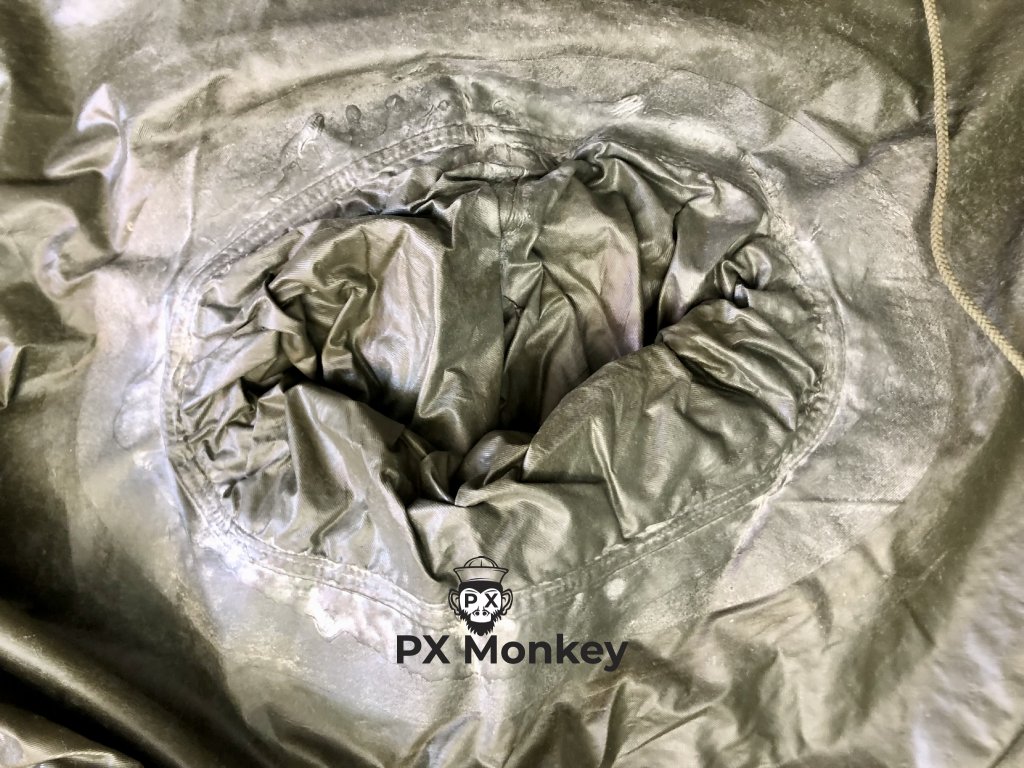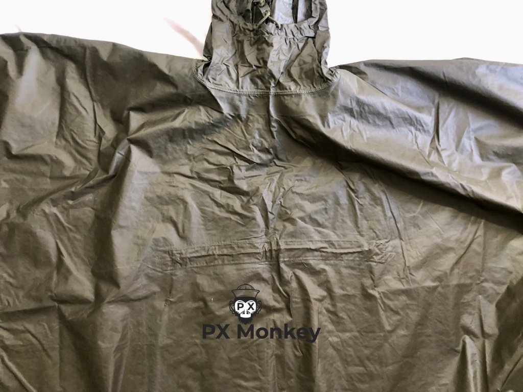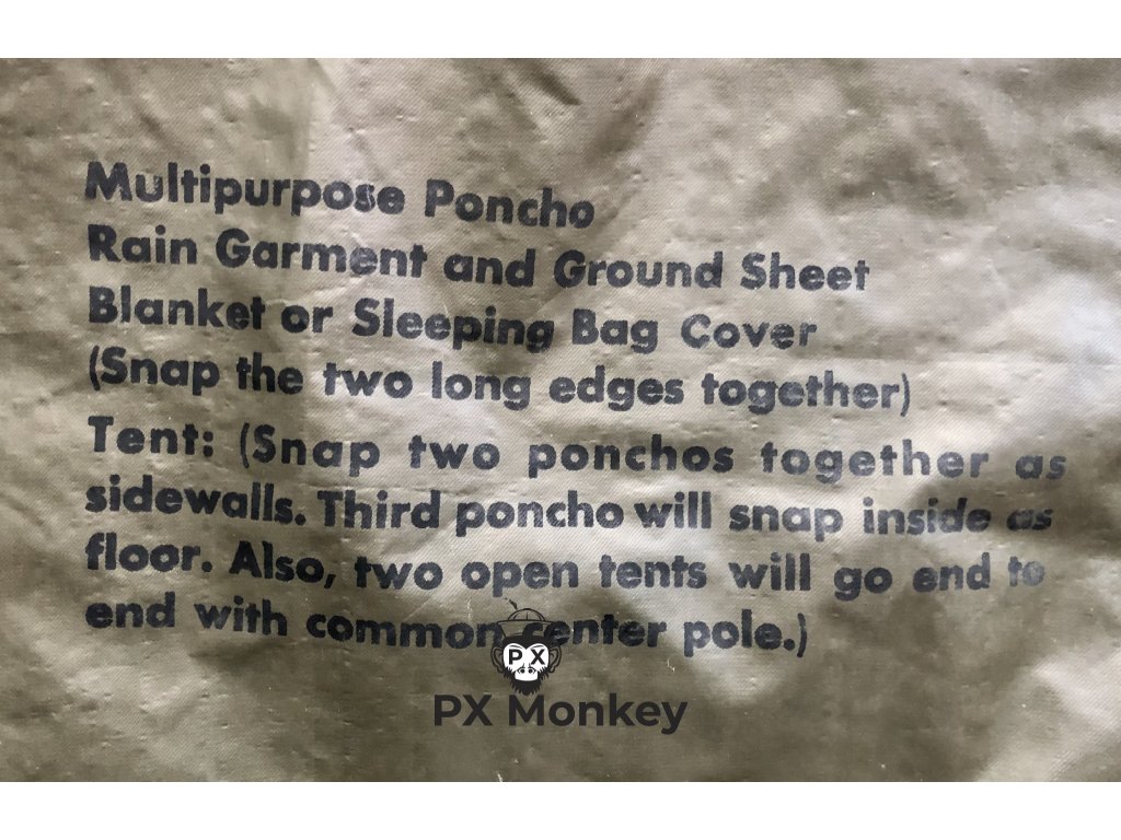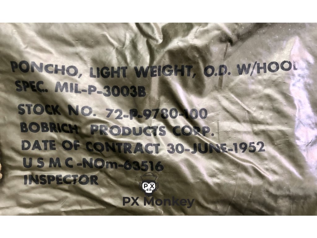 Unused USMC Poncho, Lightweight with Hood. Contract from 1952. This type of poncho does not survive in many pieces. Most were used up during the Vietnam War. The poncho is similar to the type introduced in the 1960s but is made of a much lighter material. Long-term storage.