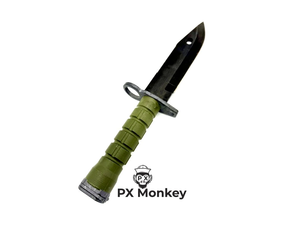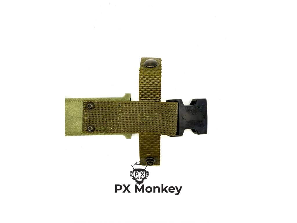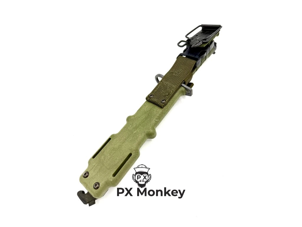 Up for sale is the legendary M9 combat knife and bayonet, that defined the era of operations in Iraq and Afghanistan. This specific piece was manufactured in the year 2000 by the renowned American firm Ontario Knife Co. (OKC), evidenced by clear stampings on both the blade and scabbard, and the date code on the ITW Nexus buckle. The bayonet features an Olive Drab handle and scabbard with a black phosphatized blade. The knife is in Mint / Unissued / New Old Stock (NOS) condition – it has never been sharpened, field-carried, and shows only minimal scabbard insertion marks, which proves its authenticity. It comes complete with the scabbard featuring the wire-cutter system, built-in sharpening stone on the back, and quick-release Fastex belt hanger. Given that OKC permanently closed its USA factory in 2023, this is a highly prized investment piece whose value, especially in Europe, is skyrocketing. This is not a commercial copy, but a genuine military contract item.