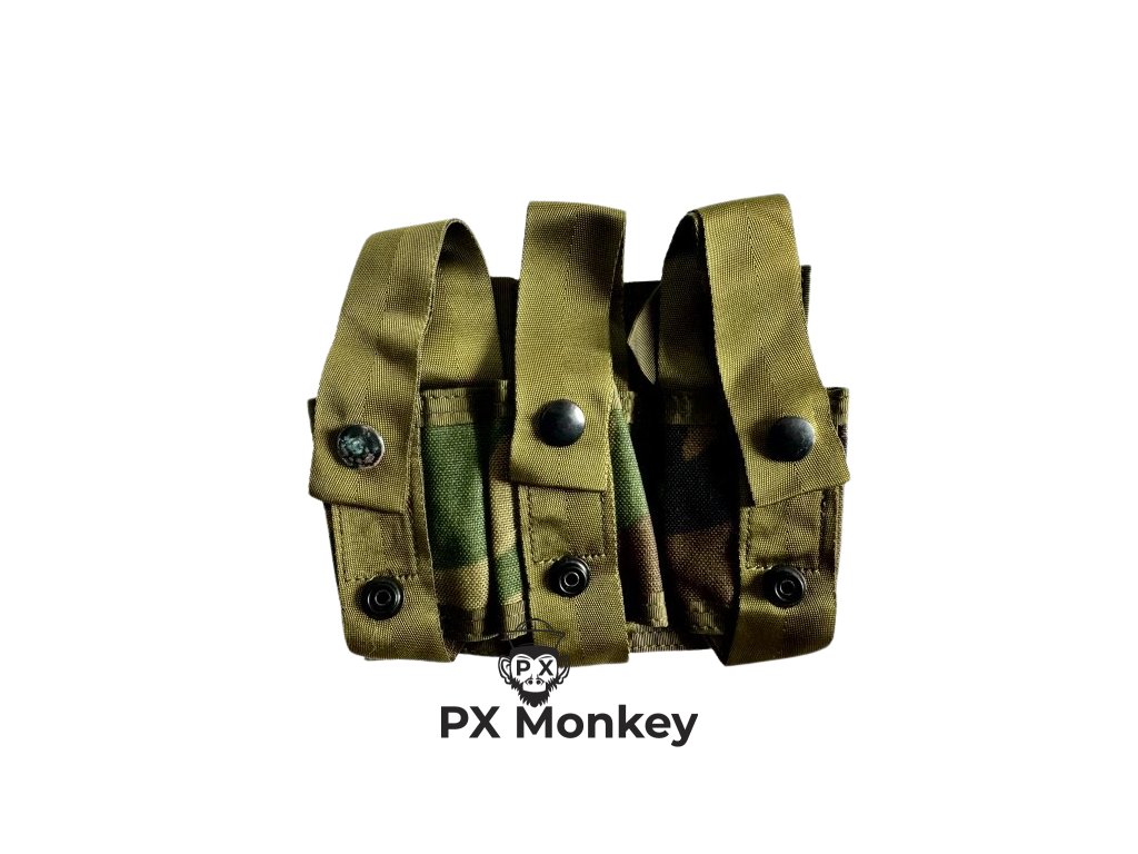 Lightly used pouch for three 40mm grenades with Alice clips. Woodland camouflage (M81).