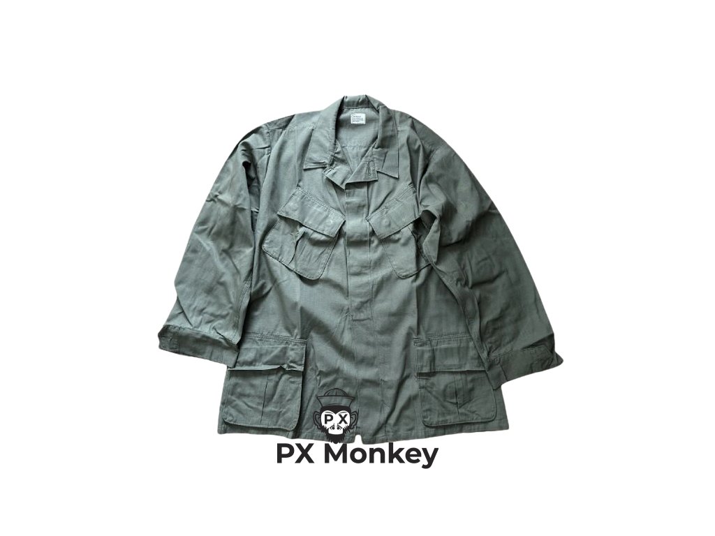 Unused Tropical Combat Uniform (Coat, Man's, Cotton W/R RIP-STP POPLIN OG 107). Size Large Regular. Unused condition. Contract DSA 100-69-C-1362.