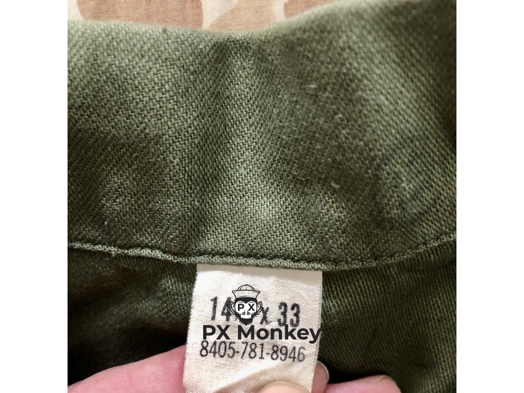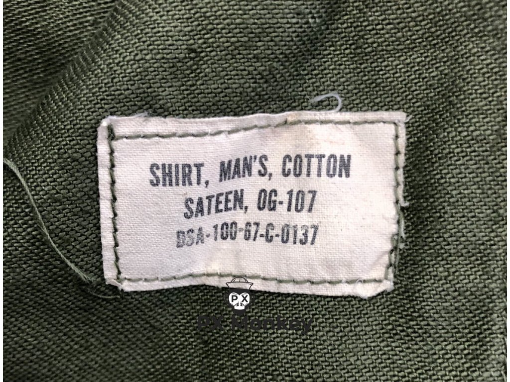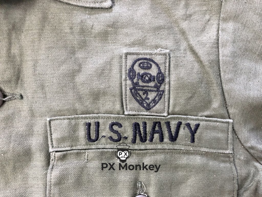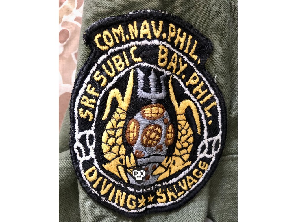 Shirt Camp (Shirt, Man's, Cotton Sateen, OG-107). Year of manufacture 1967. Size 14 1/2 x 33 (roughly corresponds to Small). Embroidered U.S. Navy and Salvage Diver ribbon. Color Com patch on shoulder. Nav. Phil. SRF Subic Bay Phil. Diving Salvage. SRF stands for Ship Repair Facility and Subic Bay (Philippines) was the home base of the 7th Fleet.