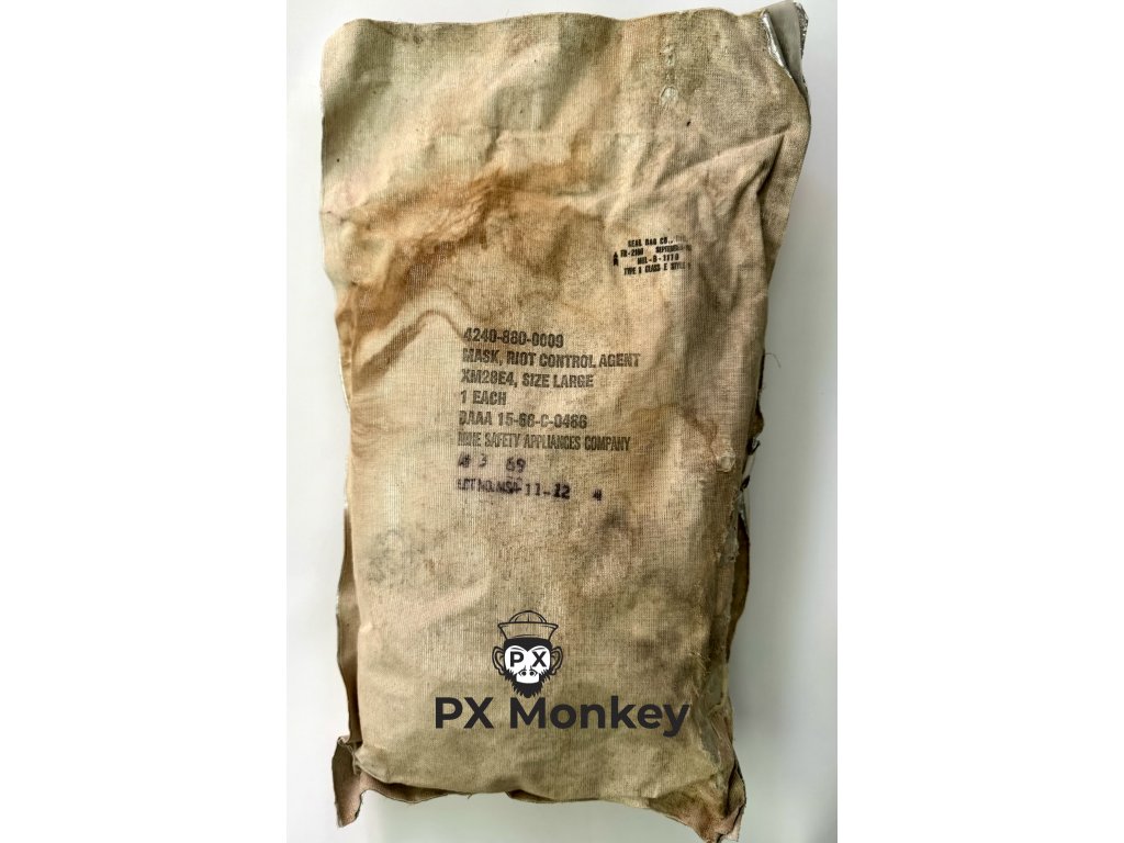 Original packaged Gas Mask, Riot Control Agent XM28E4. Size Large. Packing date 1969.