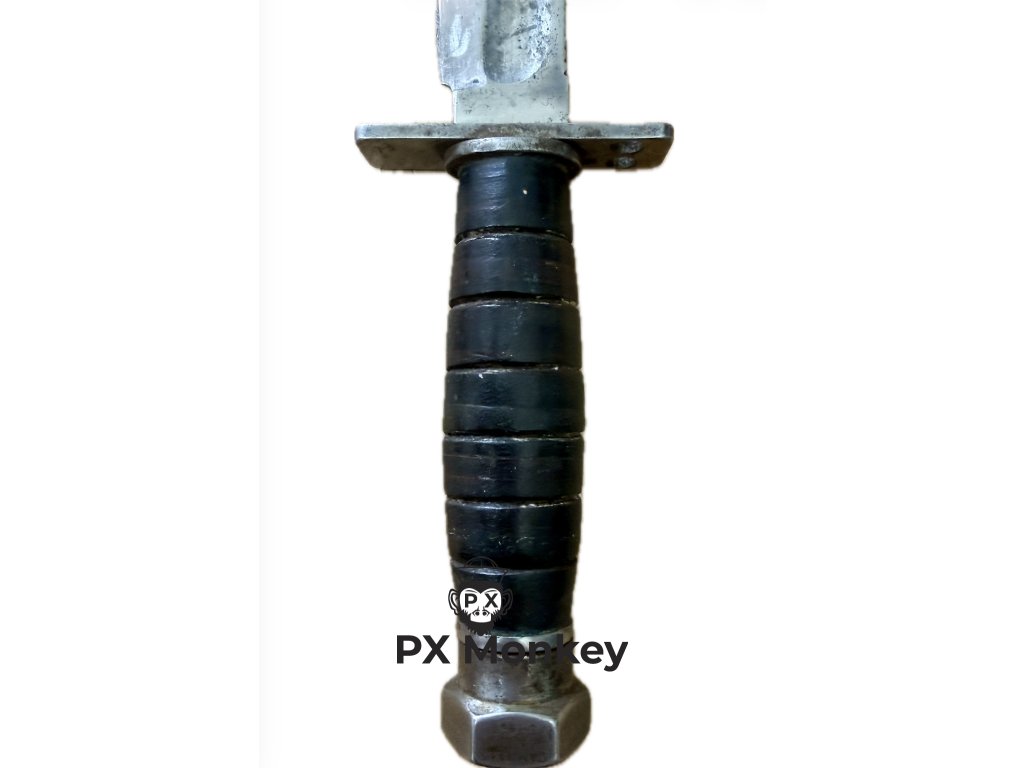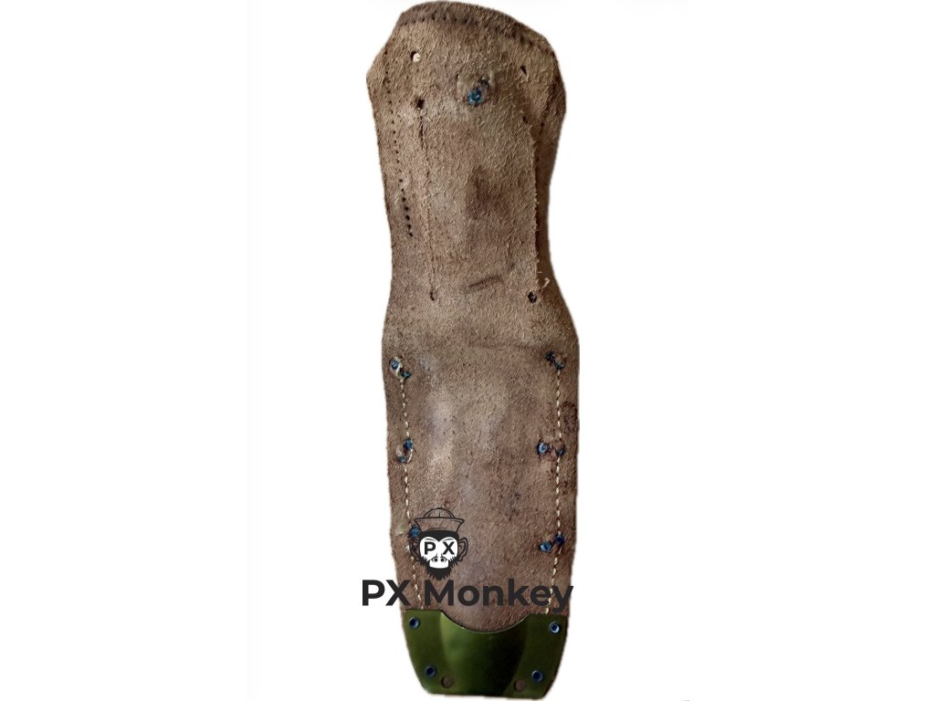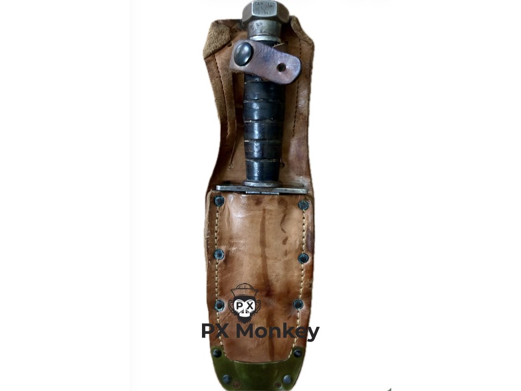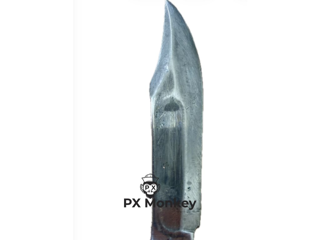 Rare Sheath Variant: This knife is paired with a highly unusual atypical leather sheath. Unlike the standard issue, it was manufactured without the sharpening stone pocket, yet it retains the metal tip protector plate at the bottom. This represents a scarce variation for collectors.