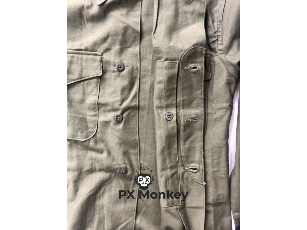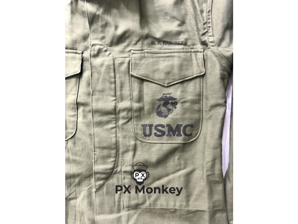 Unused USMC P-56 shirt. Introduced in 1956. The cut is based on an earlier version of the P-53. The P-56 differs from its predecessor only in that it is made of cotton satin as opposed to cotton HBT. Size 36 (Small). The name M. R. Ramirez is printed above the pocket.