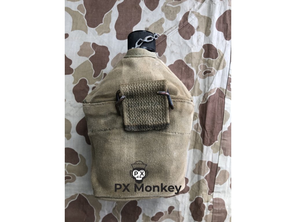 Used USMC black enamel field bottle. The packaging is the type without a funnel on the bottom. The cover is marked with spray painted number 521.