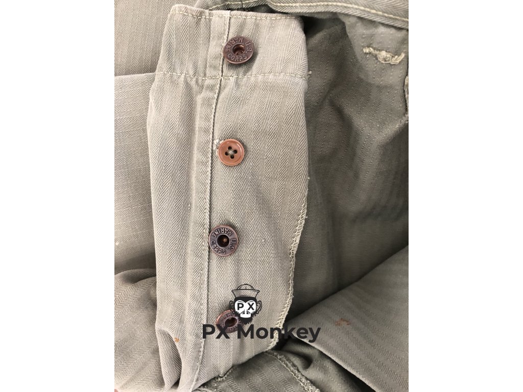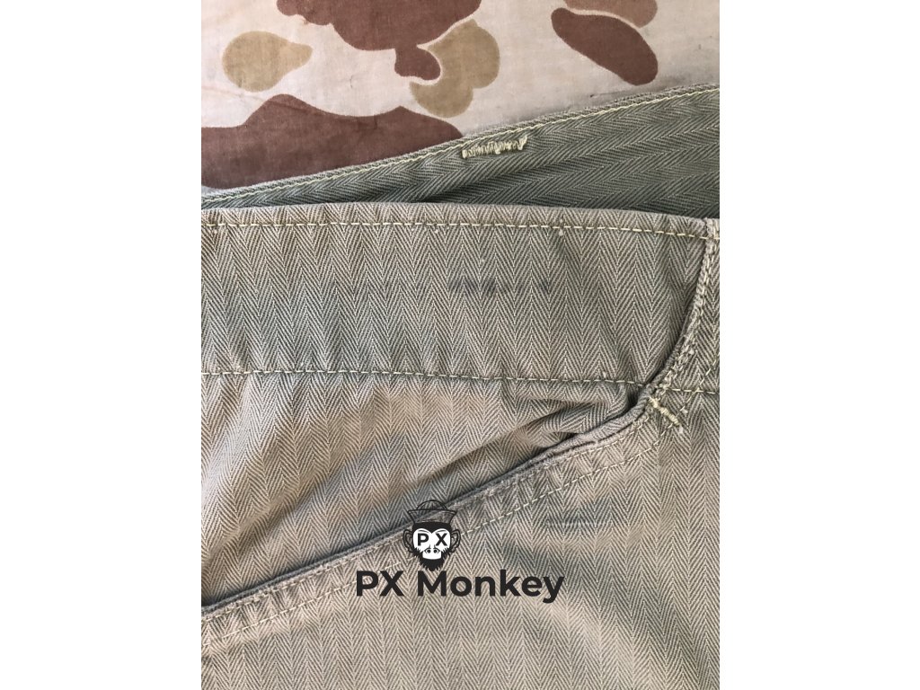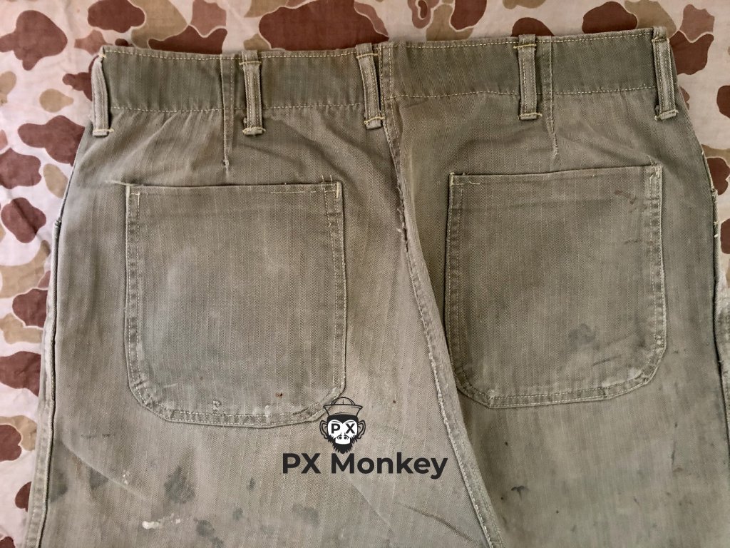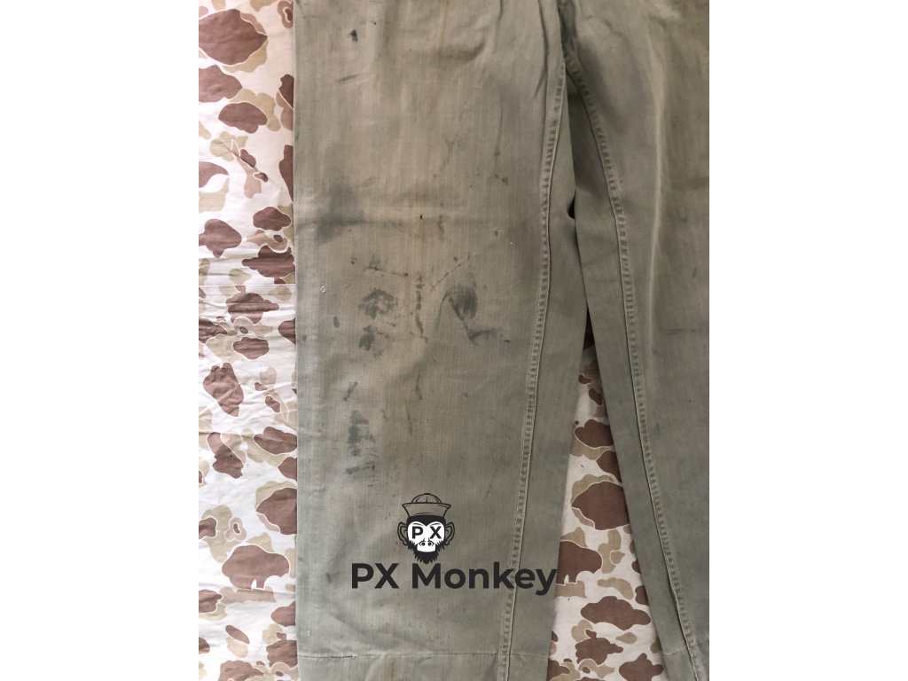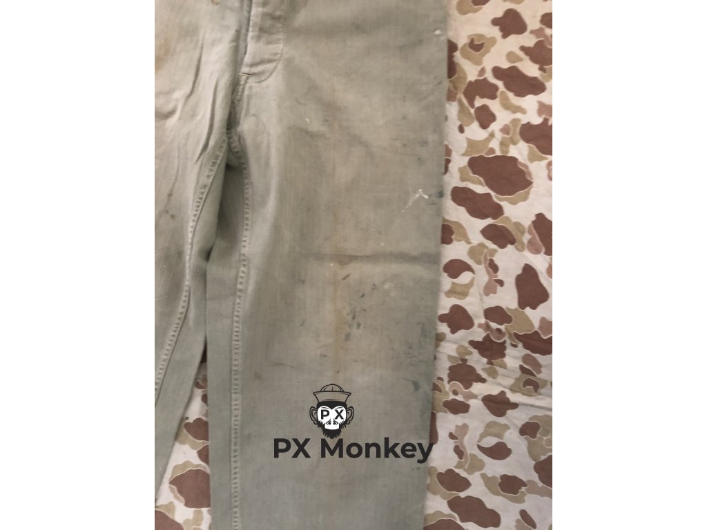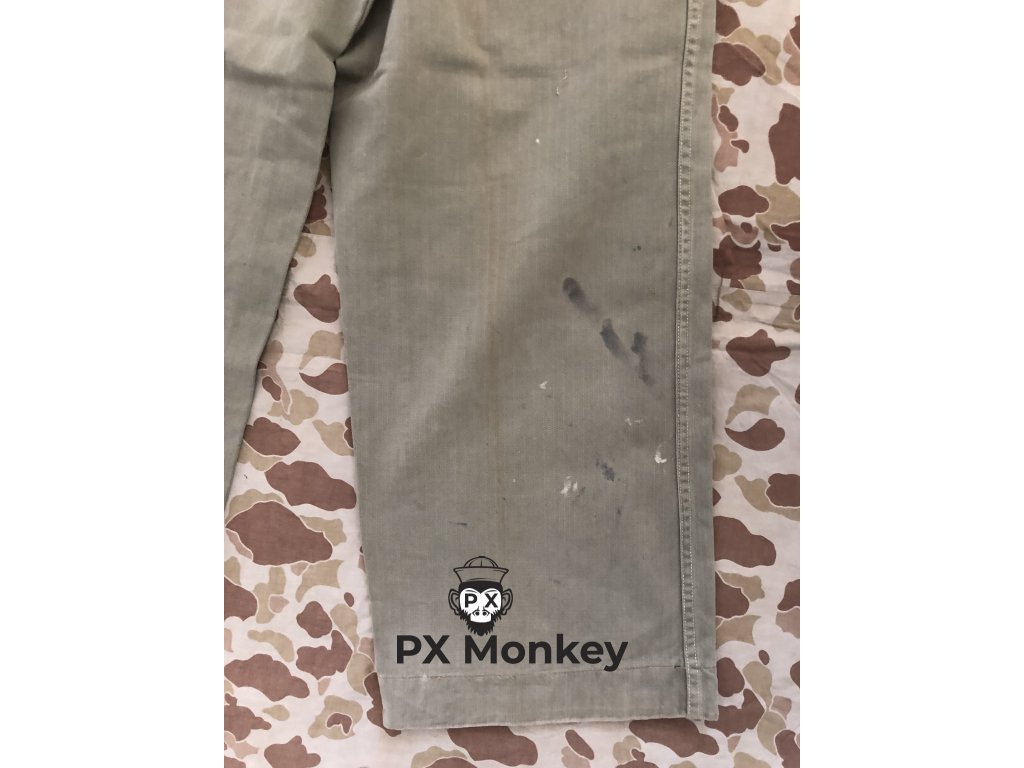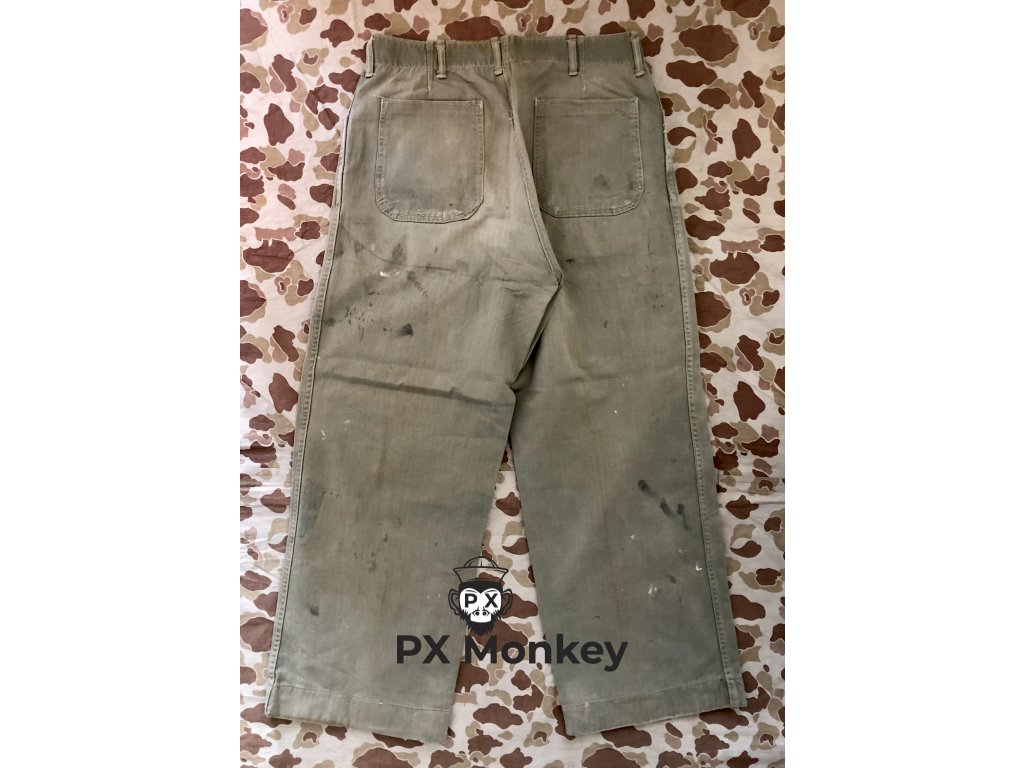 USMC P41 HBT TROUSERS. Pants have paint stains on them. One button has been replaced. Waist 82cm, waist - legs 102cm, crotch - legs 72cm.