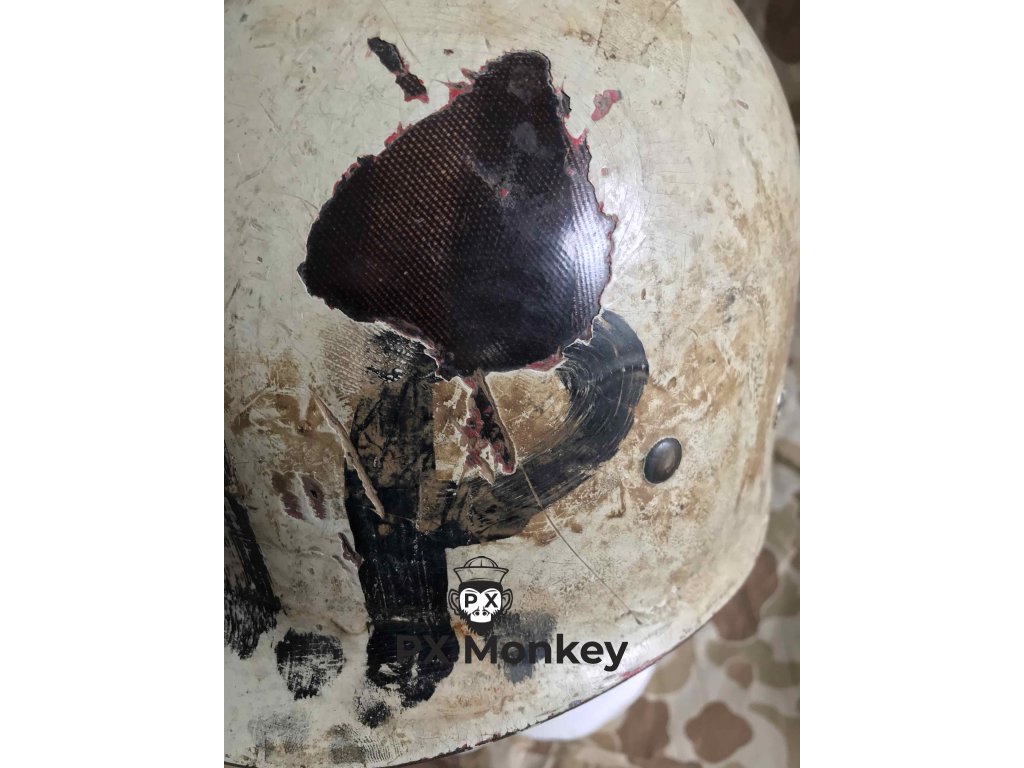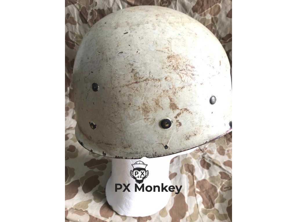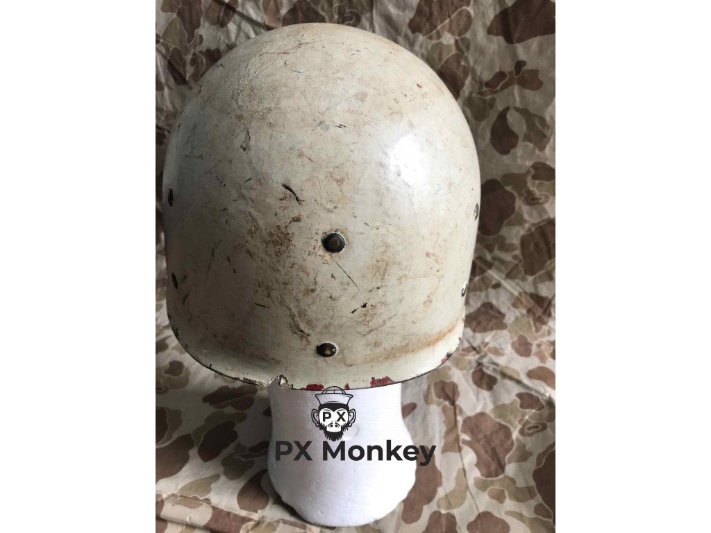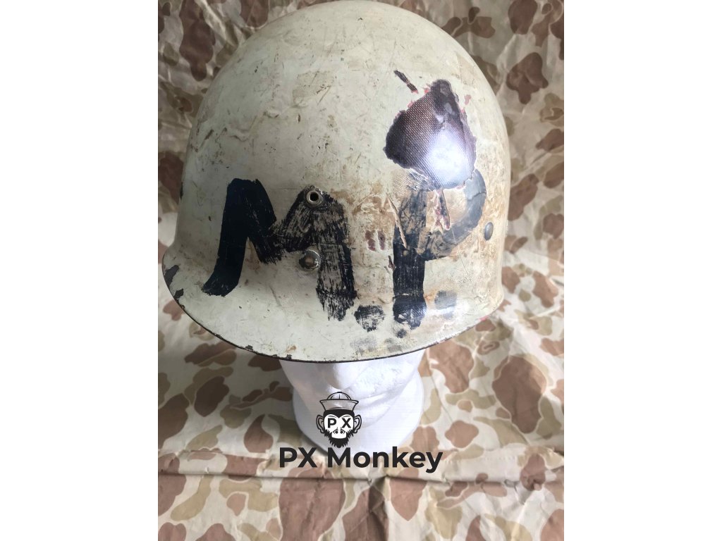 USN M1 helmet, with black and anti vesicant camo as used on shores of Iwojima. Liner was painted red once as standard color scheme for fire control/damage control, later repainted white with hand painted MP letters. Helmet with front seam and swivel bales, made by Schlueter, liner made by Firestone.