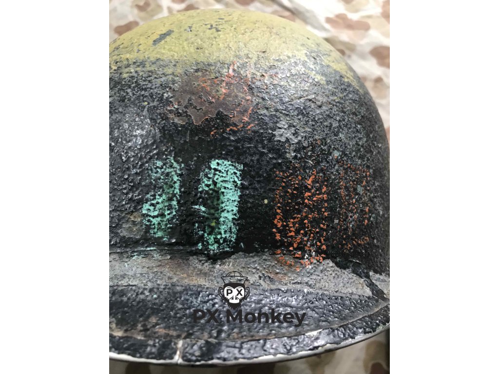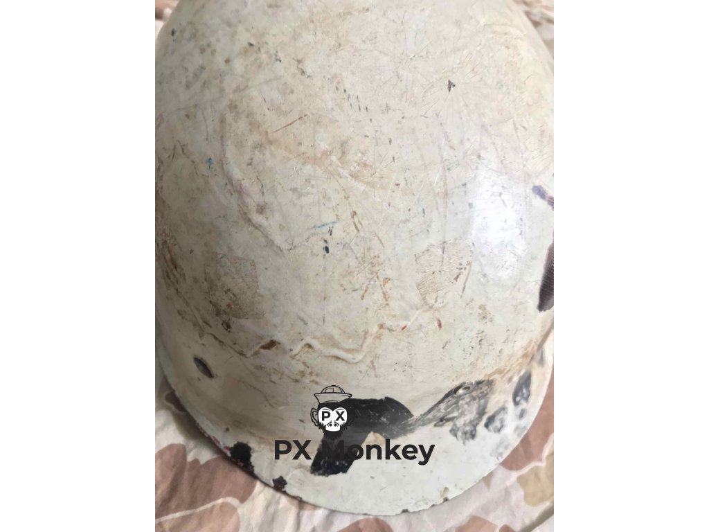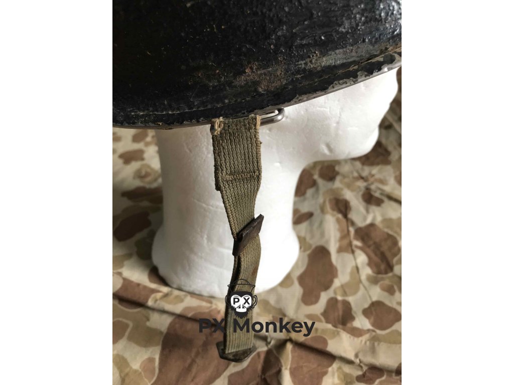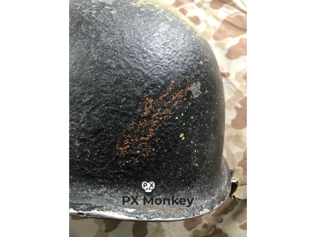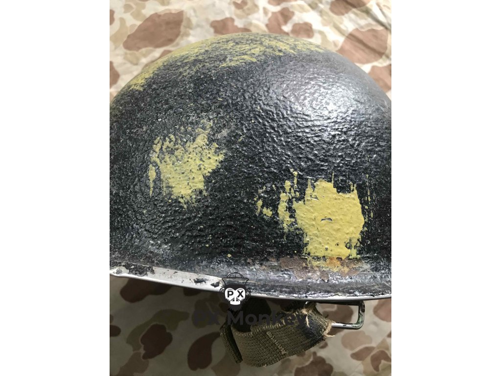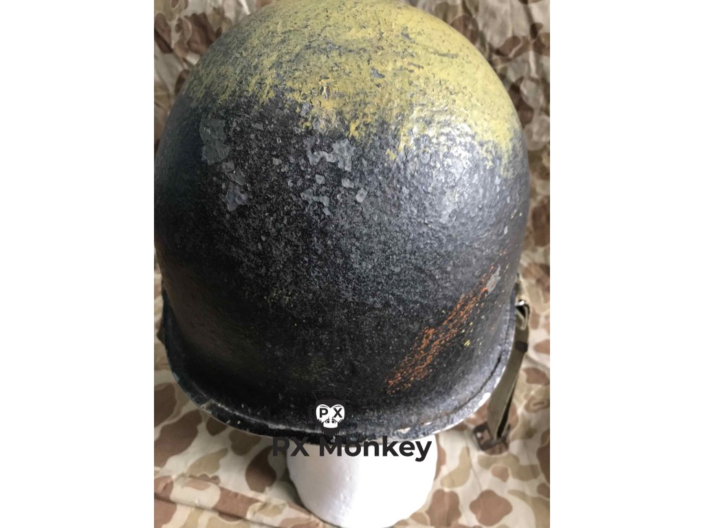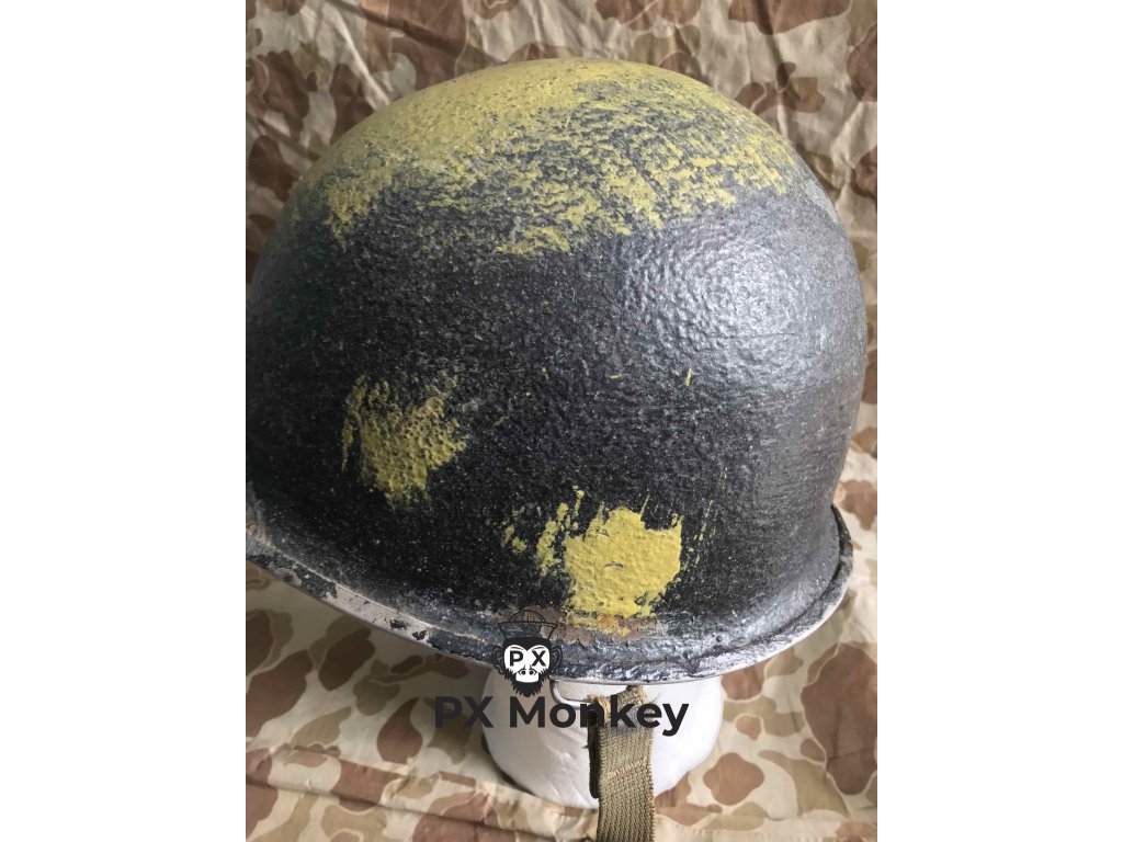 USN M1 helmet with camouflage done in black and the "chemical" paint used on the Iwojima. Where the paint has been painted over the bib, the original paint is visible. The liner was originally painted red as the standard color scheme for Fire Control/Damage Control. The red was later repainted white with the letters MP hand painted on. Sheet metal front seam and swivel bales. Manufactured by Schlueter. Liner by Firestone.
