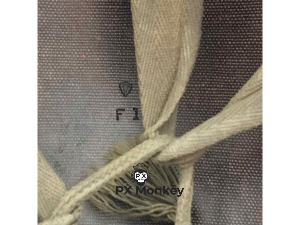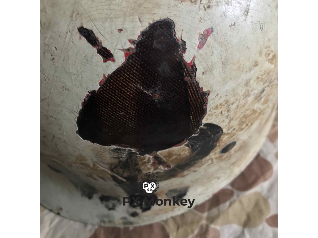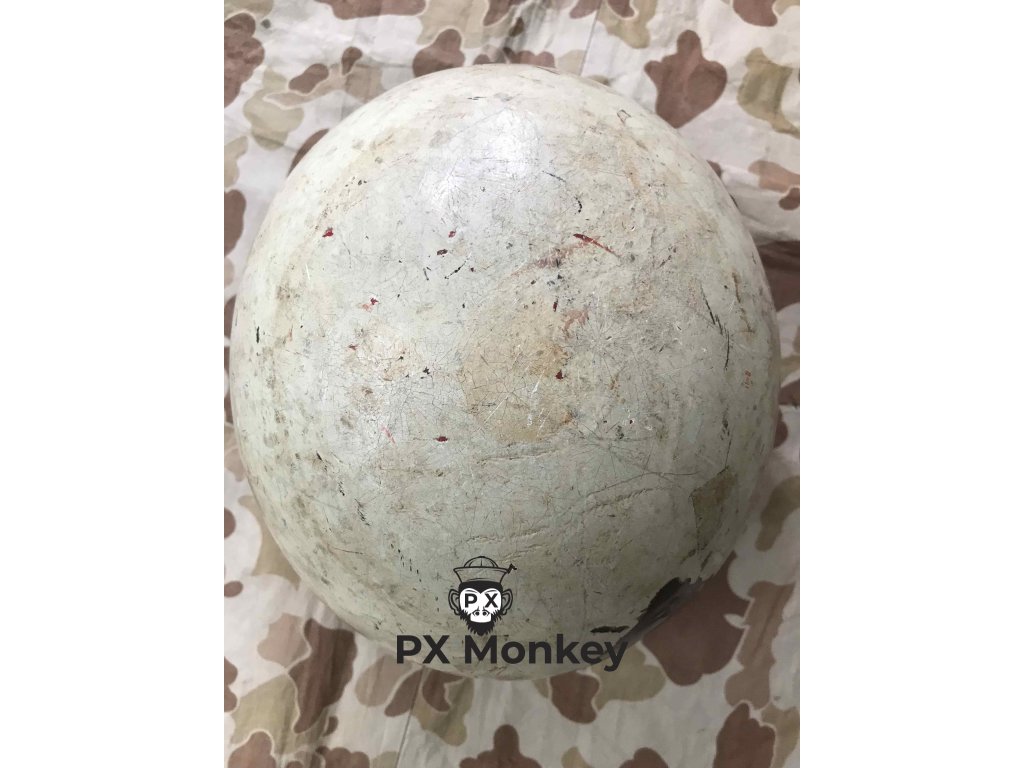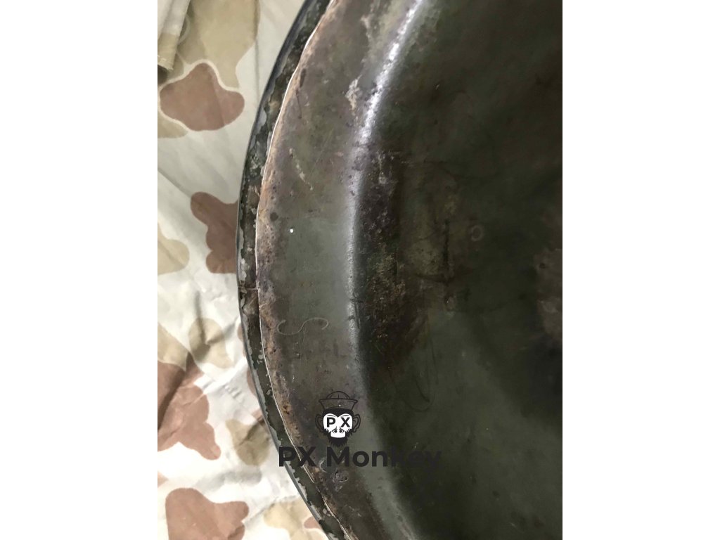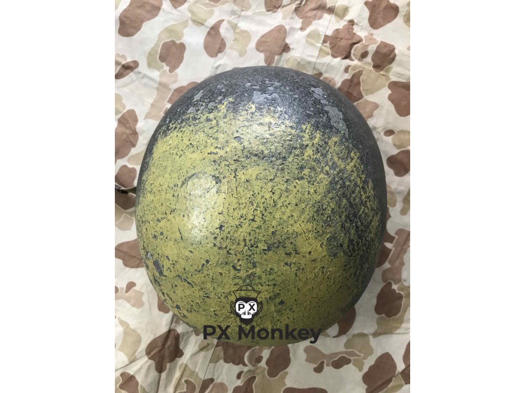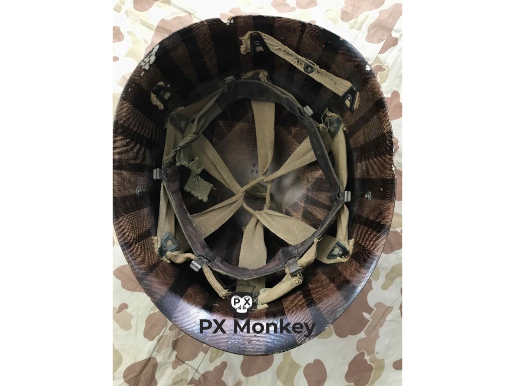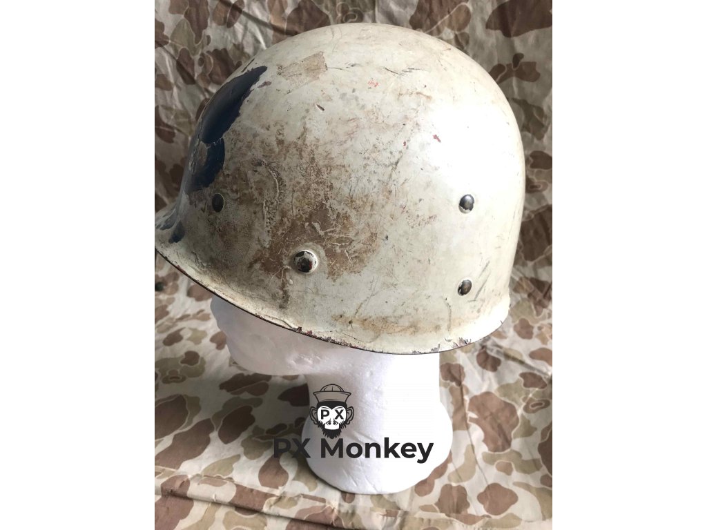 USN M1 helmet with camouflage done in black and the "chemical" paint used on the Iwojima. Where the paint has been painted over the bib, the original paint is visible. The liner was originally painted red as the standard color scheme for Fire Control/Damage Control. The red was later repainted white with the letters MP hand painted on. Sheet metal front seam and swivel bales. Manufactured by Schlueter. Liner by Firestone.