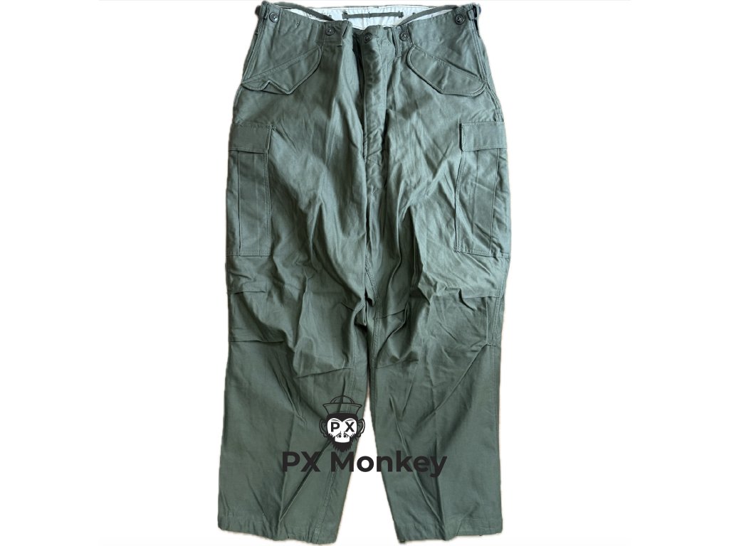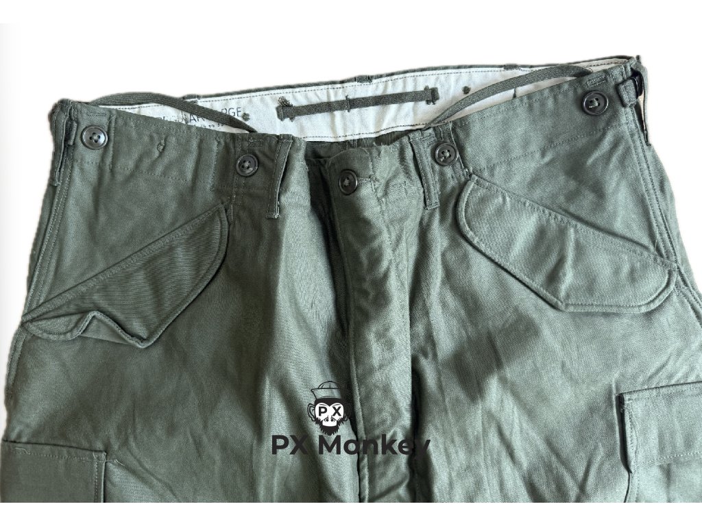 Kalhoty M-51 jsou robustnější a teplejší než novější modely. Jsou vyrobeny z těžké směsi vlny a bavlny (Wool/Cotton Serge), která skvěle izoluje. Tento konkrétní kus je osazen autentickým hliníkovým zipem (stříbrná barva), což je charakteristický znak pro produkci z 50. let. V pase mají výrazné knoflíky pro připnutí kšand (šlí) a disponují stahovacími pásky pro úpravu obvodu.