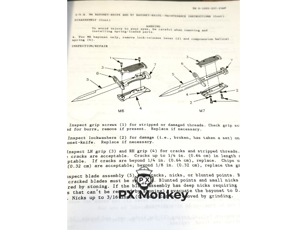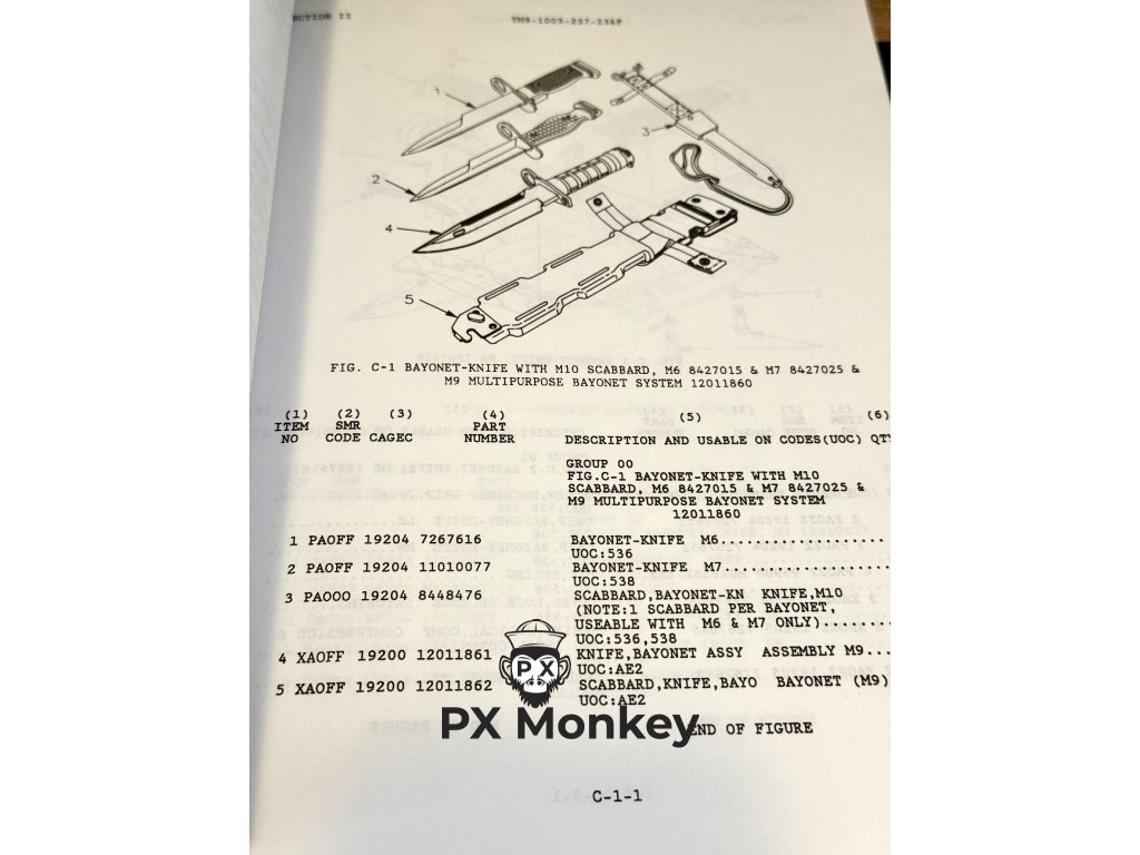 Jedná se o vyšší úroveň manuálu – Organizational and Direct Support Maintenance Manual (TM 9-1005-237-23&P). Na rozdíl od základních uživatelských příruček (úroveň -10) obsahuje tento dokument detailní rozkresy všech součástek (Exploded views) a kompletní seznam náhradních dílů a NSN kódů (Repair Parts and Special Tools List) pro tři nejikoničtější americké bajonety z období studené války a války v Zálivu: M6 (pro pušku M14), M7 (pro pušku M16) a systém M9.