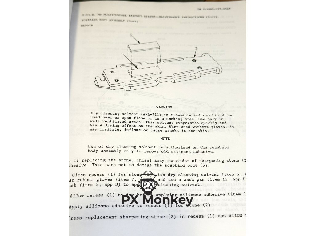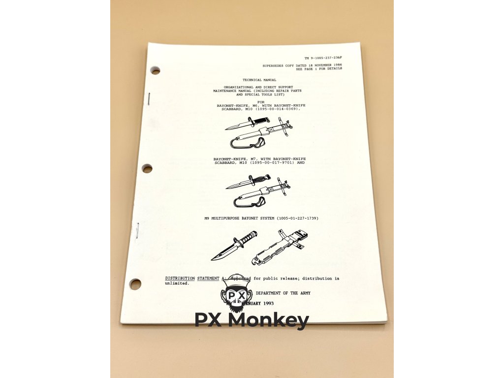 Nabízíme k prodeji nezbytnou "bibli" pro každého sběratele amerických chladných zbraní. Tento originální vojenský předpis TM 9-1005-237-23&P vydaný v lednu 1993 je určen pro zbrojíře a detailně pokrývá údržbu, opravy a kompletní rozborku bajonetů M6, M7 a moderního systému M9. Na úctyhodných 98 stranách velkého formátu naleznete fantastické technické nákresy, postupy pro výměnu poškozených čepelí, rukojetí či brusného kamene u pochvy M9. Obsahuje také kompletní seznamy náhradních dílů s jejich armádními kódy (NSN). Stav: Zcela nový (NOS - New Old Stock), nepoužitý, připravený k založení do šanonu.