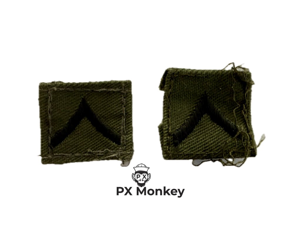 Historie a určení: Hodnost Private (PV2) představuje druhý nejnižší stupeň v US Army (hned po PV1, který nenosí žádné označení). Tlumené látkové provedení (Subdued) sloužilo k zachování maskování a našívalo se na oba límce polní uniformy.