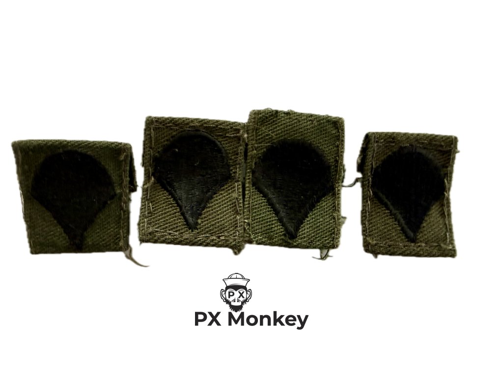 Historie a určení: Hodnost Specialist (E-4) je vyhrazena vojákům s technickou nebo specifickou odborností (odpovídá hodnosti desátníka - Corporal, ale bez velitelských povinností). Tlumené látkové provedení se našívá na oba límce polní uniformy.
