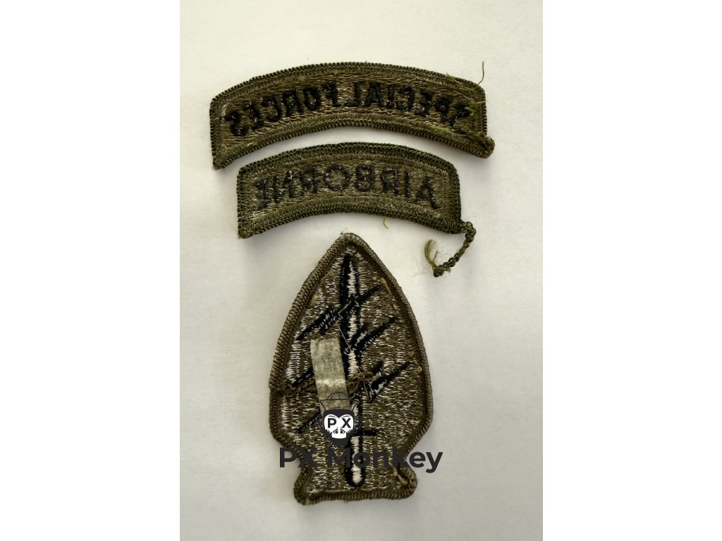 Třídílný komplet: Set se na levý rukáv našíval přesně v tomto pořadí (shora dolů): "Special Forces" Tab (potvrzení úspěšného absolvování Q-Course), "Airborne" Tab (výsadkářská kvalifikace) a hlavní znak SSI ve tvaru indiánského šípu.