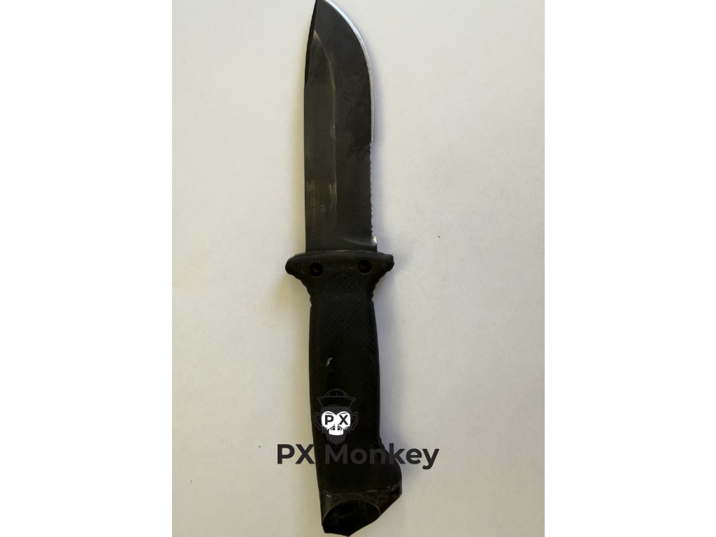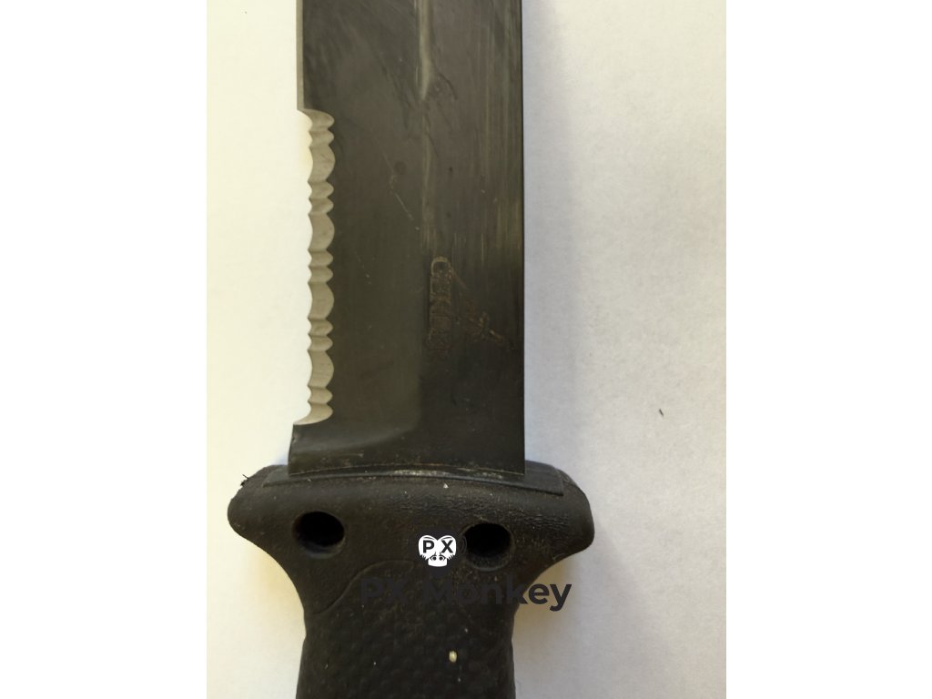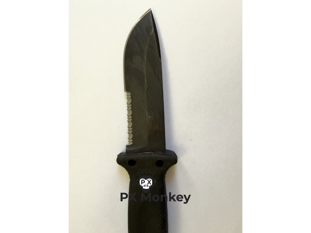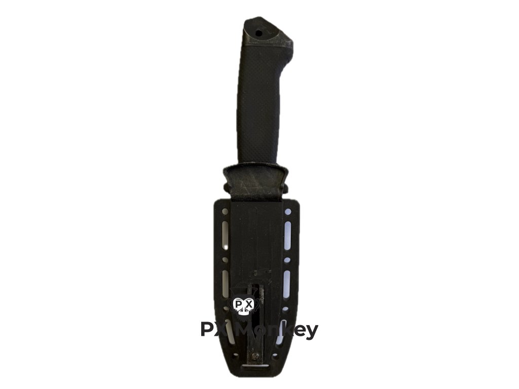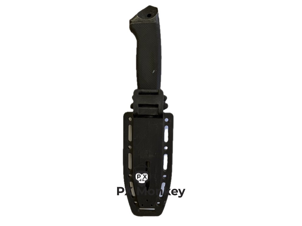 Pouzdro: Součástí je originální plastová pochva s integrovaným V-brouskem (při vytažení a zasuňutí se nůž ostří). Upozornění: Textilní nosný systém a popruhy na nohu chybí. Pouzdro lze přichytit k výstroji např. paracordem nebo stahovacími páskami.