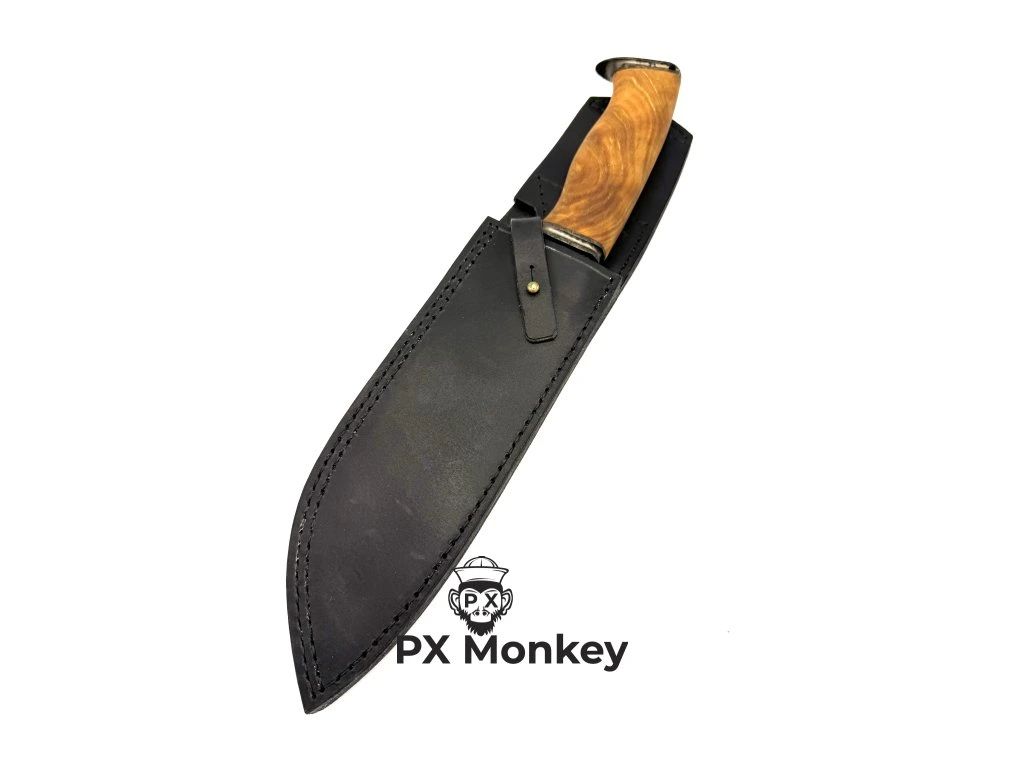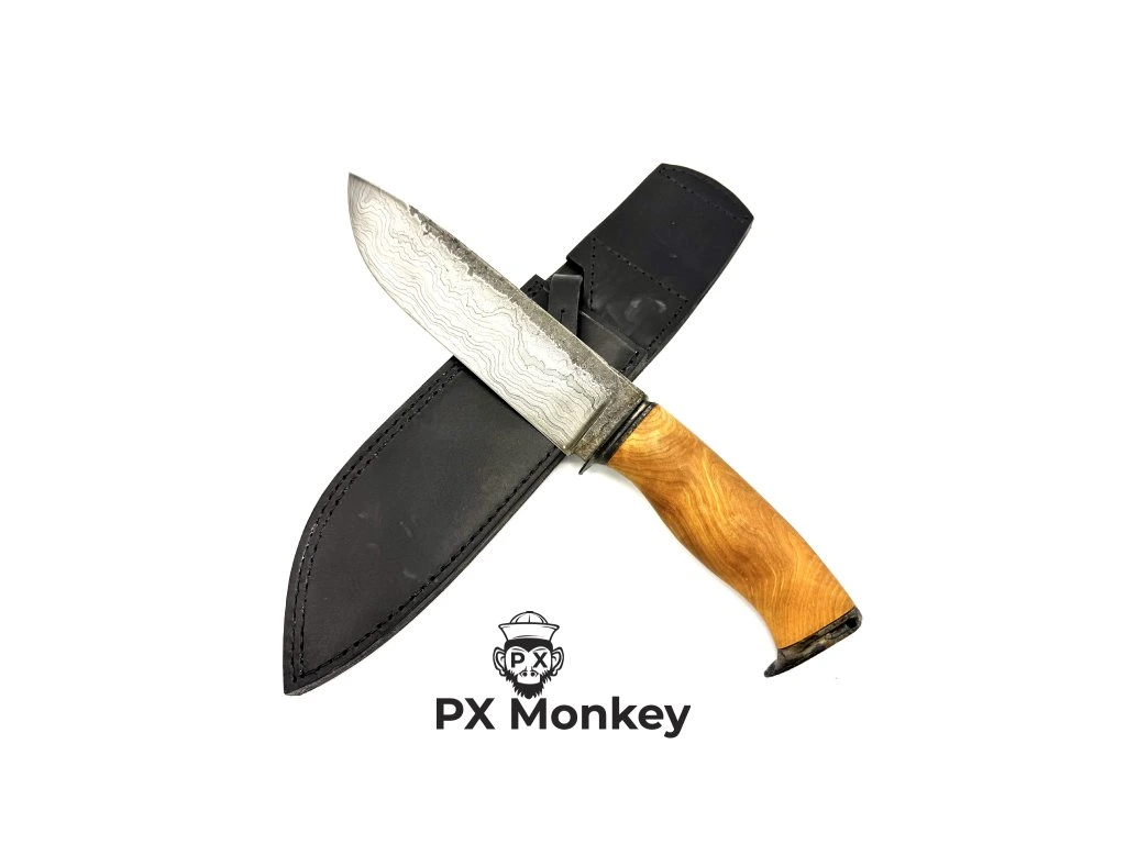 Zcela výjimečný kousek pro milovníky špičkového nožířského řemesla. Tento masivní, ručně kovaný nůž pochází z dílny uznávaného mistra kováře. Čepel o působivé délce 210 mm a tloušťce 5,5 mm ve hřbetu je vykována z nádherného svářkového damašku, který kombinuje uhlíkovou nástrojovou ocel ČSN 19418 a prémiovou švédskou ocel Uddeholm 75ni8. Nůž je kalený a popuštěný na nekompromisní tvrdost 61-62 HRC s plochým výbrusem a fazetkou jedovatě vytaženou na 23 stupňů. Rukojeť je mistrovským dílem sama o sobě – vyrobena z překrásného nádoru břízy a napuštěna lněným olejem pro vyniknutí textury dřeva. Záštita a patka jsou z tepané a ohněm patinované oceli. Nůž má extrémně pevnou konstrukci: trn prochází celou rukojetí, je jištěn kolíkem, na konci roznýtován přes patku a navíc pojištěn epoxidem. V patce nechybí otvor pro závěsnou šňůru. K noži patří masivní, ručně šité pouzdro z kvalitní celoprobarvené hověziny. Upozornění pro fajnšmekry: Jedná se o vysokouhlíkovou, tzv. "živou ocel", která není nerezová. Čepel tak získá časem krásnou autentickou patinu a vyžaduje občasné promazání – nejlépe tím, že si s ním ukrojíte pořádný kus dobrého salámu!