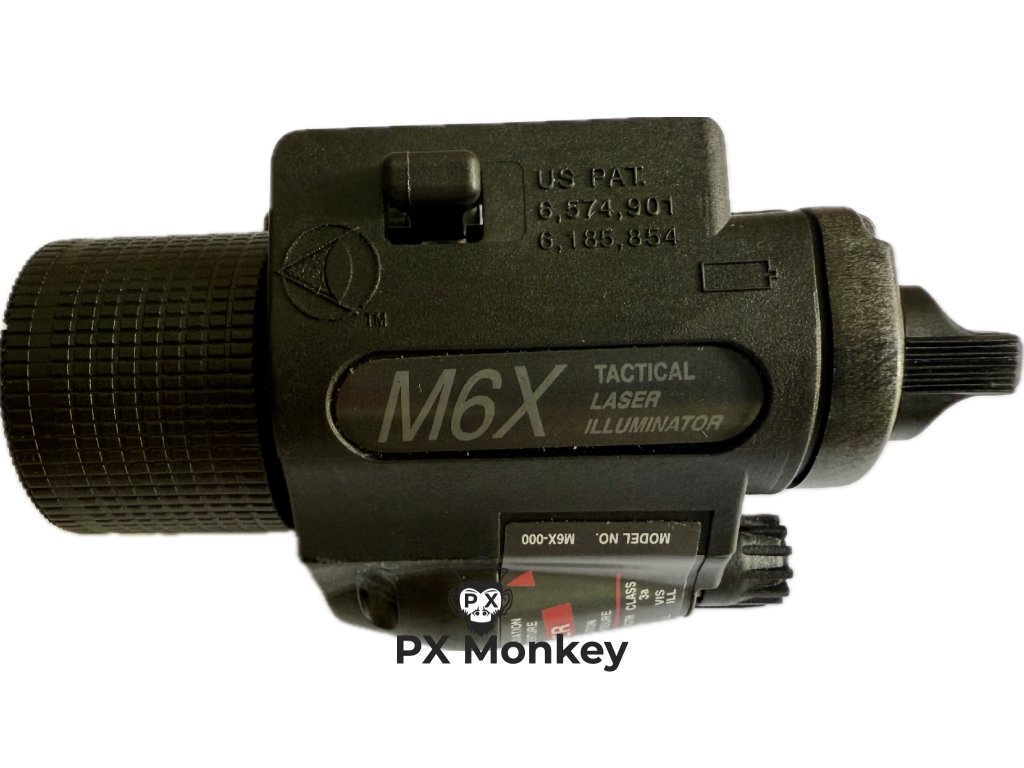 Nepoužitý taktický laserový svítilna M6X byla navržena a vyrobena pro příslušníky amerických speciálních jednotek. Svítilna funguje i v nejnáročnějších podmínkách a nejdrsnějším prostředí a zůstává vodotěsná i v hloubce až 20 metrů. Vysoce výkonná LED dioda poskytuje maximální výkon 150+ lumenů při použití dvou lithiových baterií 123 a má provozní dobu dvě hodiny. LED M6X využívá viditelný červený laser třídy III, který má dosah 200 metrů. Laser je nastavitelný ve výšce a stranovém posunu, což umožňuje jeho přesné zaměření. Standardní výbavou modelu M6X je 4polohový přepínač ve spojení s oboustranným kolébkovým přepínačem umístěným na odnímatelné zadní desce. Přepínač má následující polohy: zablokování, pouze laser, pouze bílé světlo nebo kombinace bílého světla a laseru. Jakmile vyberete požadovaný výstup, můžete aktivovat M6X LED pomocí kolébkového spínače, který přepnete dolů pro momentální zapnutí nebo zamknete pro trvalé zapnutí. M6X LED je vybaven univerzálním držákem Slide-Lock, který se hodí pro většinu pistolí, a je dodáván se dvěma západkami, které zajišťují správné uchycení. Laser a světlo fungují.