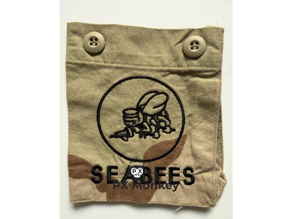 Motiv: Na kapse je kvalitní černá výšivka ikonické "Bojující včely" (Fighting Bee) a nápisu SEABEES. Tento typ přímé výšivky na uniformu si jednotky často nechávaly dělat na zakázku během nasazení ("Theater Made").