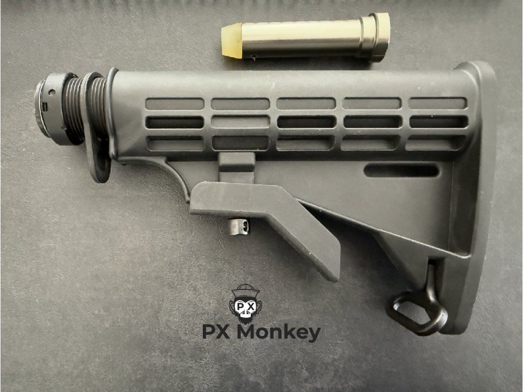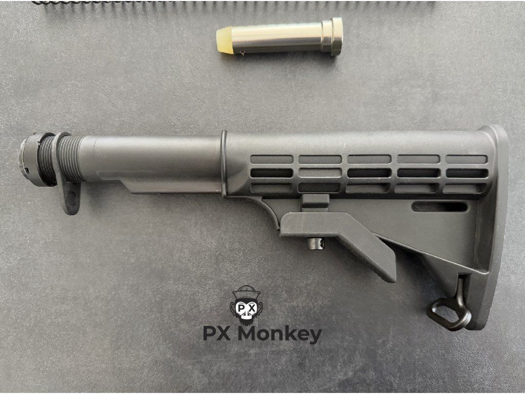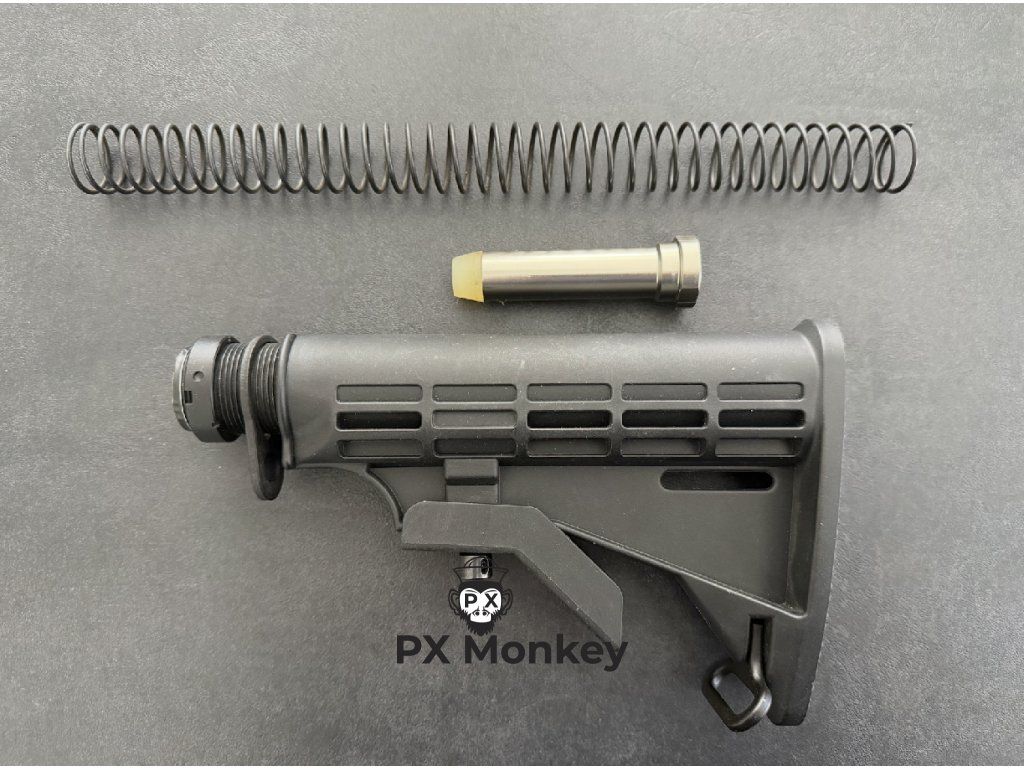 Sada obsahuje: Pažbu, Buffer tube, Castle nut, End plate, Pružinu, Buffer