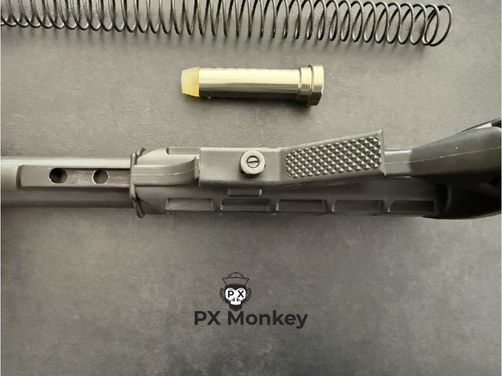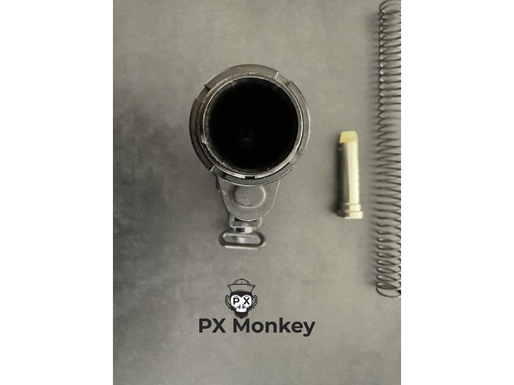Obsah balení: Sada je kompletní. Získáte tělo pažby, trubku (buffer tube), zajišťovací matici (castle nut), koncovou destičku (end plate) s okem pro připevnění nosného popruhu, vratnou pružinu a ocelový buffer se žlutým polyuretanovým dorazem.