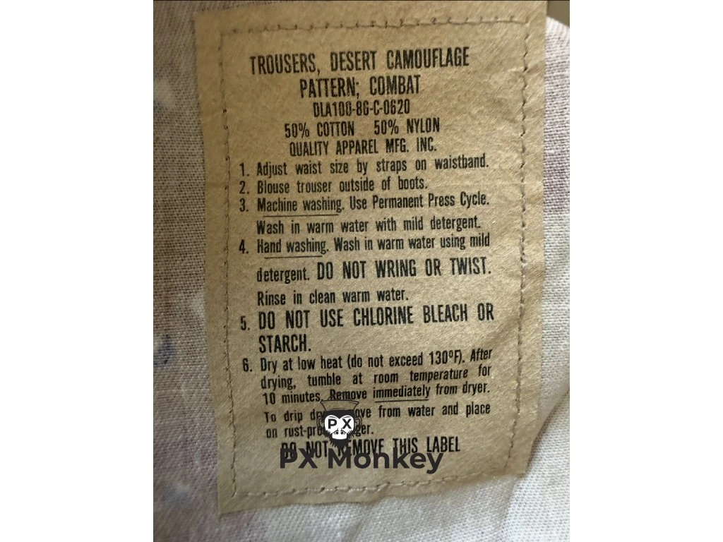 Stav a Datace: Kalhoty nesou kontraktní číslo DLA100-86-C-0620 (rok 1986). Jedná se o nenošené, neprané armádní uloženky (New Old Stock). Barvy jsou dokonale ostré a látka si drží svou původní tuhost.