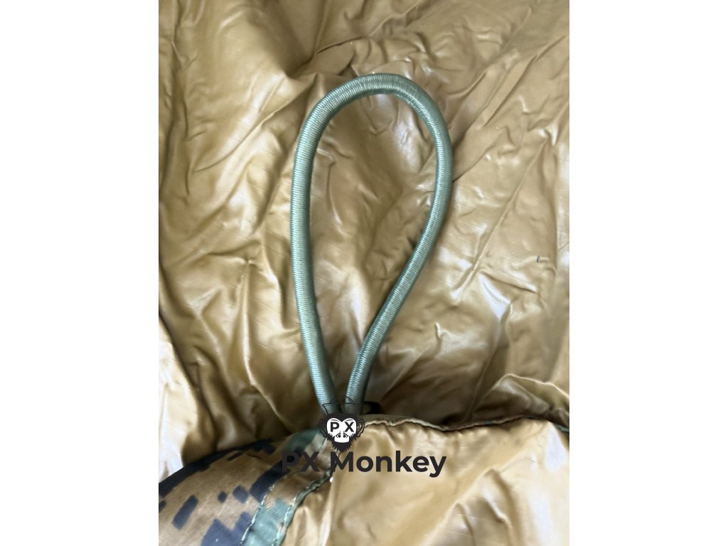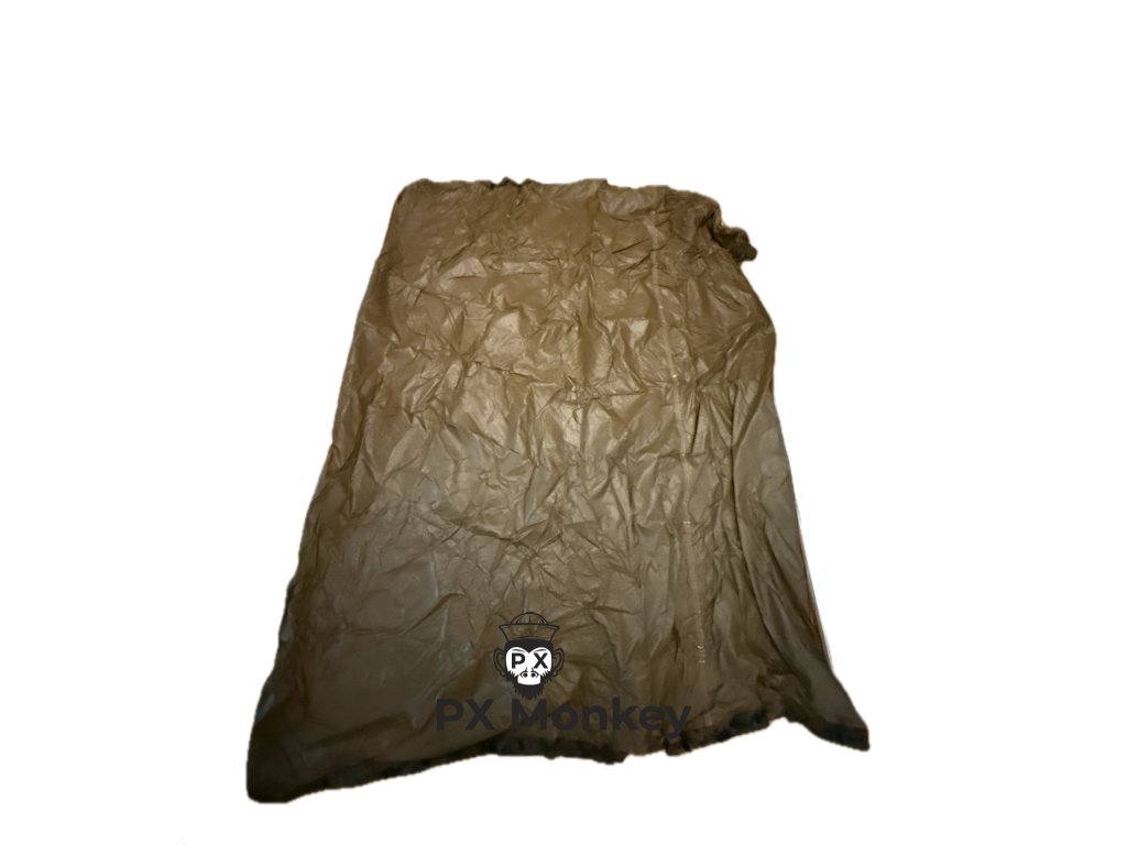 Stav zátěru (Skladová vada): Plachta nebyla nikdy venku (NOS stav), nicméně trpí delaminací. Nepromokavý polyuretanový zátěr na straně Coyote se vlivem tlaku a let ve skladu slepil, a po rozbalení se místy sloupnul a vytvořil mapy odhalující maskovací vzor pod ním. Jde o známý jev u této produkce. Pokud vyžadujete 100% nepromokavost, bude nutné plachtu impregnovat.