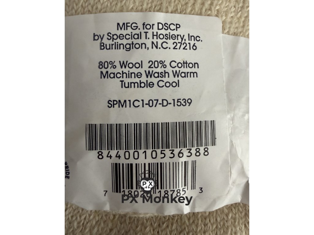 Historie a určení: Dodavatel DSCP zajišťoval výstroj pro americké síly během nejtěžších fází nasazení na Blízkém východě. Kontrakt "SPM1C1-07" přesně datuje tyto ponožky do roku 2007. Vyrobila je americká firma Special T. Hosiery, Inc. v Severní Karolíně.