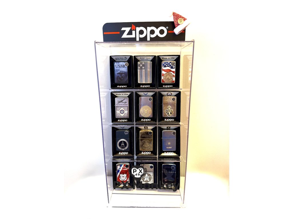 Originální vitrína: Zapalovače jsou uloženy v originálním akrylátovém prodejním stojanu Zippo s logem. Stav:Zapalovače jsou zcela nové, nikdy neškrtnuté (Unfired) a mají z výroby stále nalepené oranžové bezpečnostní plomby. Akrylátová vitrínka utrpěla během přepravy lehké poškození (praskliny), nemá to však žádný vliv na stav samotných zapalovačů.