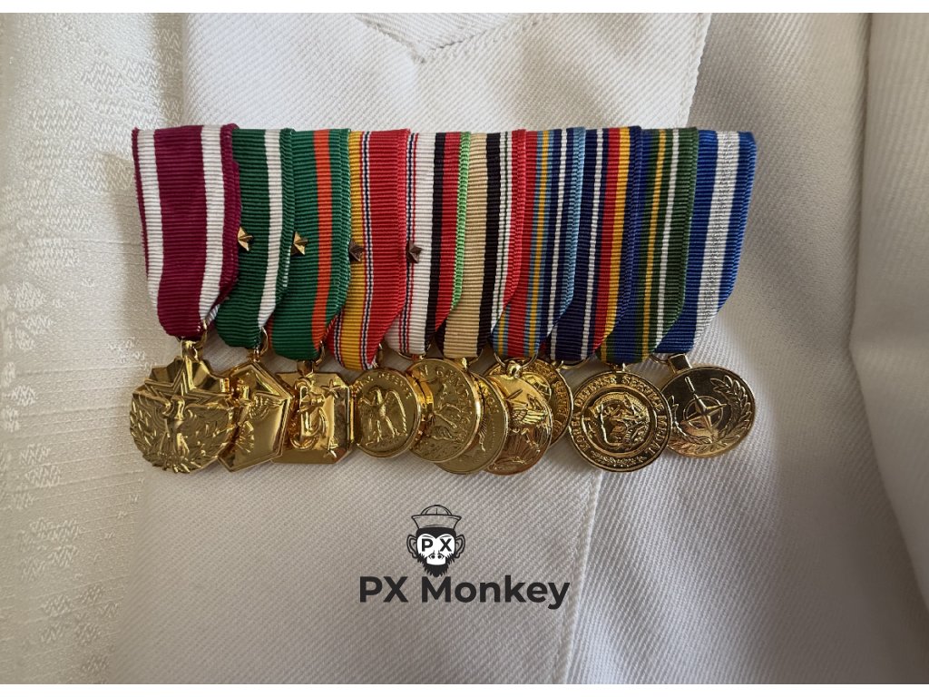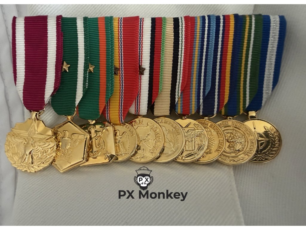 Miniatury medailí: Sako nese impozantní sadu devíti medailí, mj. Meritorious Service Medal, medaile za tažení v Afghánistánu a Iráku, Korea Defense Service Medal a NATO medaili. Bronzová hvězda na medaili za národní obranu značí službu ve více konfliktech.
