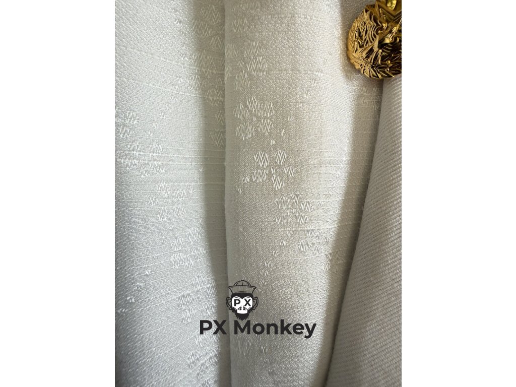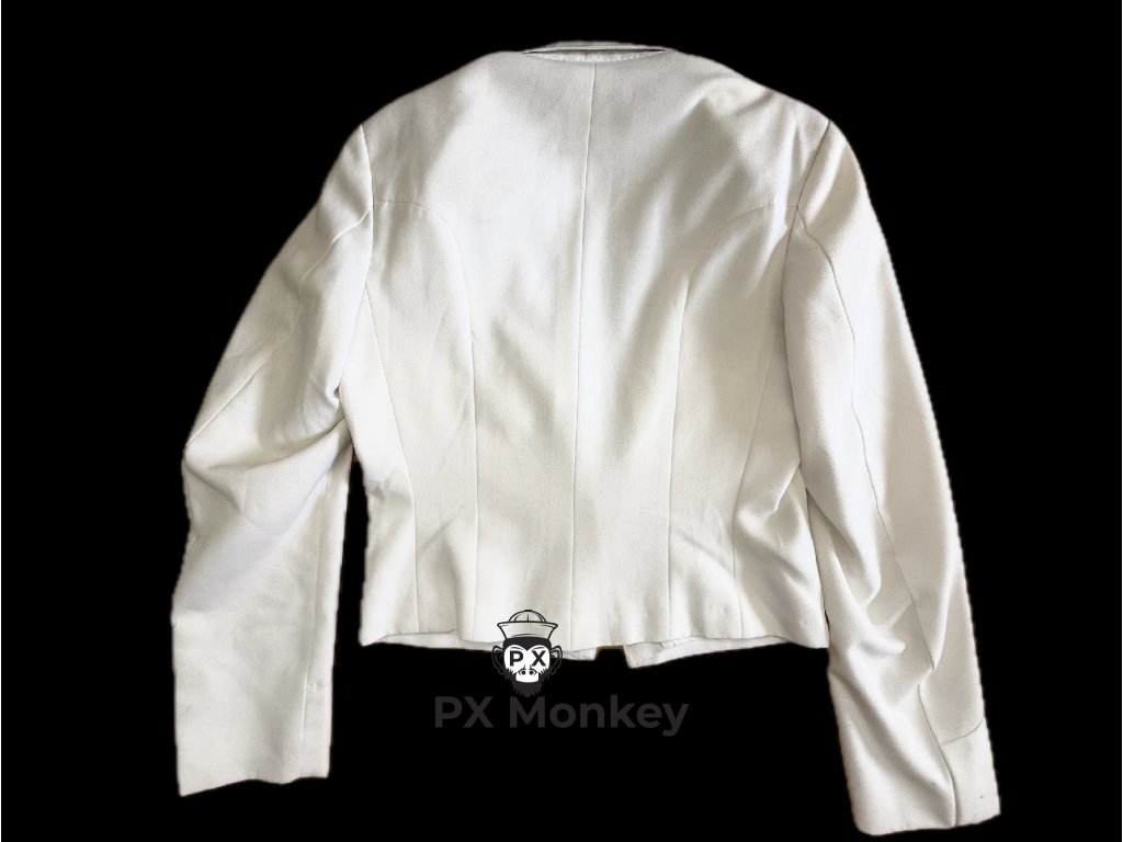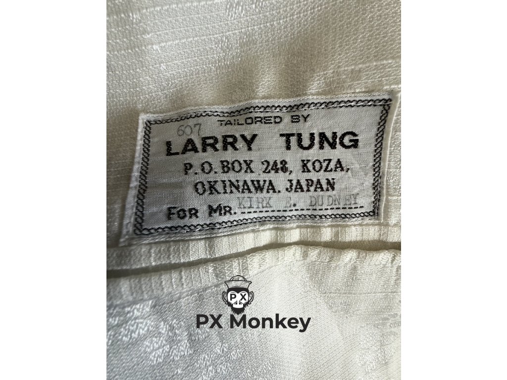 Zakázkové sako (Okinawa): Sako je mistrovským dílem tradičního asijského krejčovství (štítek "Tailored by Larry Tung, Koza, Okinawa"). Luxusní charakter podtrhuje hedvábná podšívka s vetkaným květinovým žakárovým vzorem. Na náramenících jsou stříbrné orlice pro hodnost plukovníka (O-6).