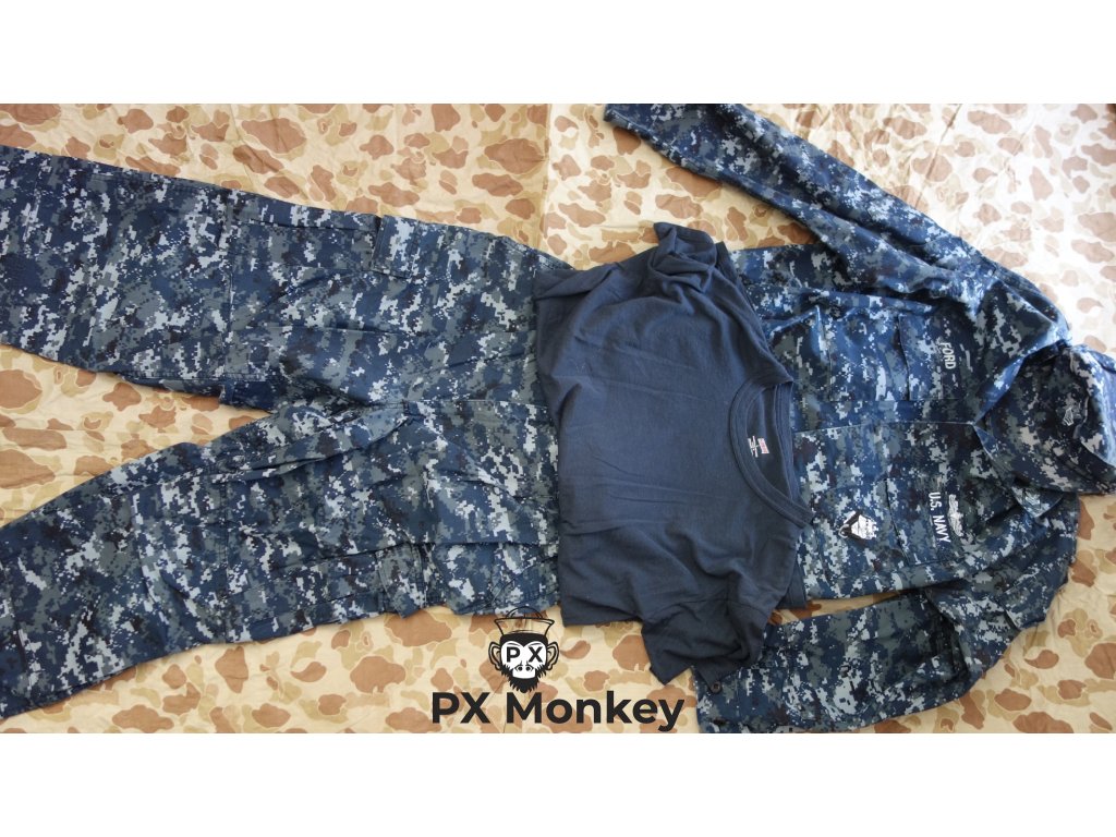 Minimálně použitá souprava US. Navy. Set obsahuje čepici vel. 7 3/8, Tričko vel. L, Blůzu a kalhoty velikosty L-L.
